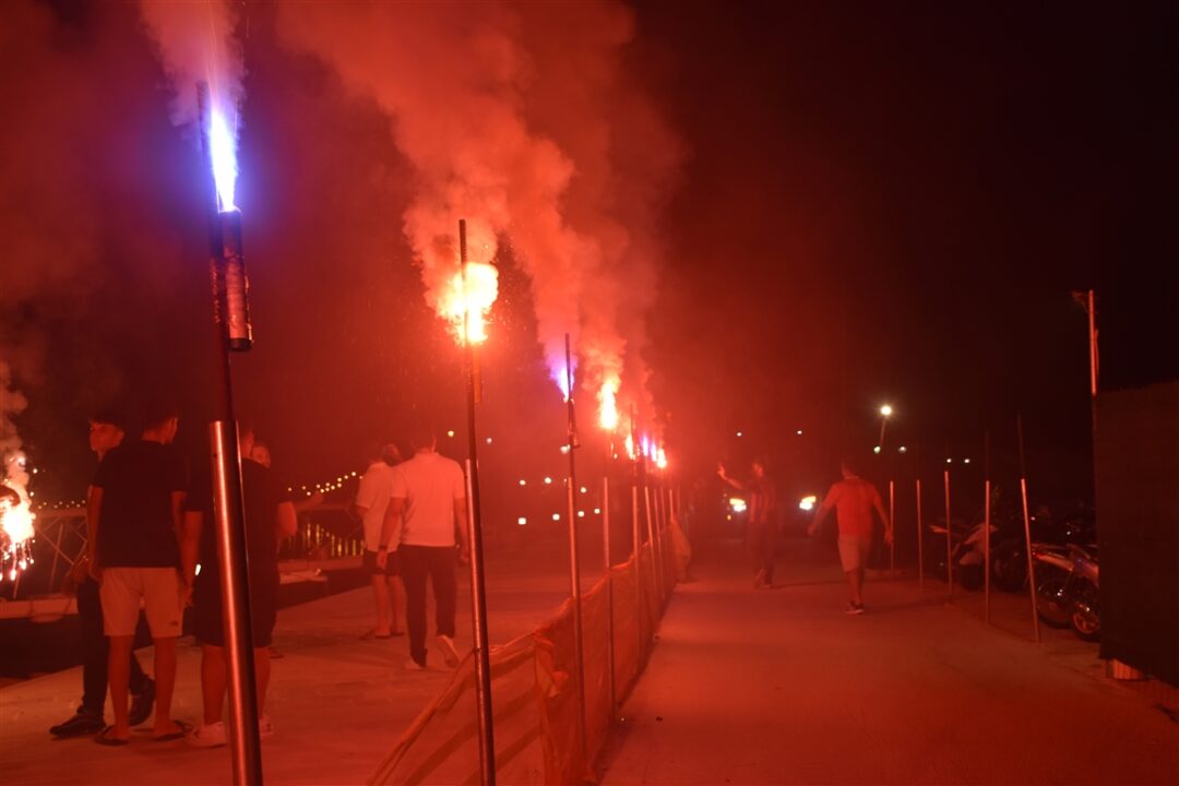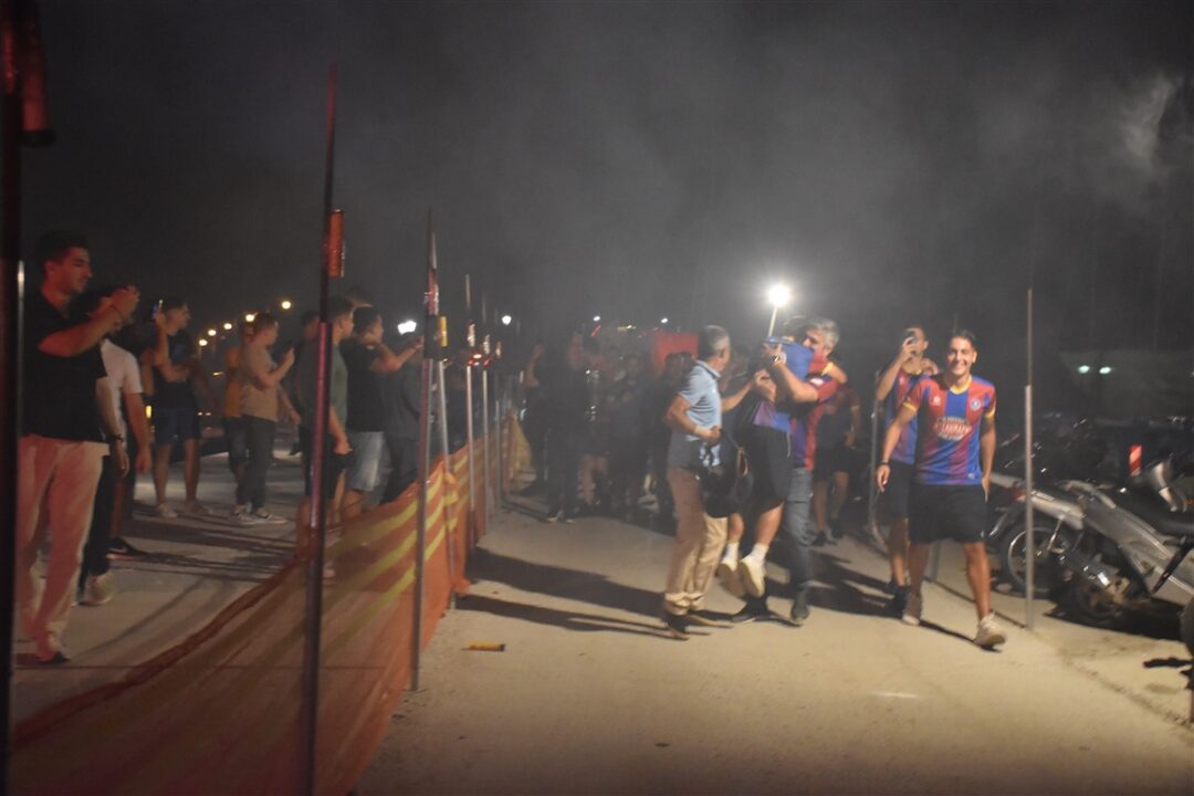 Η νύχτα έγινε μέρα και βάφτηκε στα χρώματα του Τηλυκράτη, καθώς δεκάδες φίλαθλοι με βεγγαλικά και πυροτεχνήματα περίμεναν να φτάσει στην πλωτή γέφυρα το πούλμαν που μετέφερε την αποστολή του Τηλυκράτη.