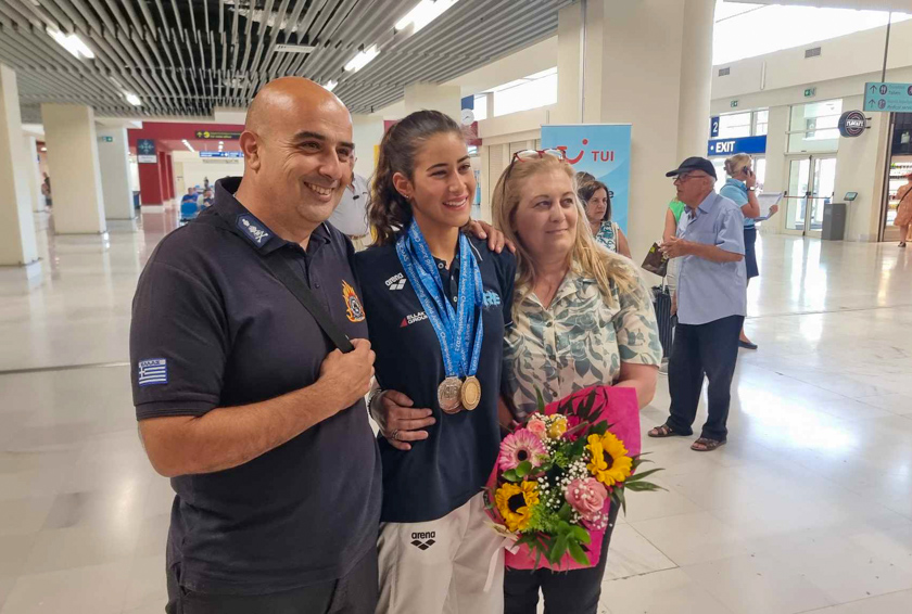 Η αίθουσα αφίξεων του αεροδρομίου Χανίων “Ιωάννης Δασκαλογιάννης” πλημμύρισε από φωνές και ενθουσιασμό για να υποδεχθεί την Γεωργία Περάκη, γεγονός αναμενόμενο μετά τη… θραύση που προκάλεσε στο πλαίσιο της συμμετοχής της στο παγκόσμιο πρωτάθλημα τεχνικής κολύμβησης που διεξήχθη στο Κάιρο της Αιγύπτου.