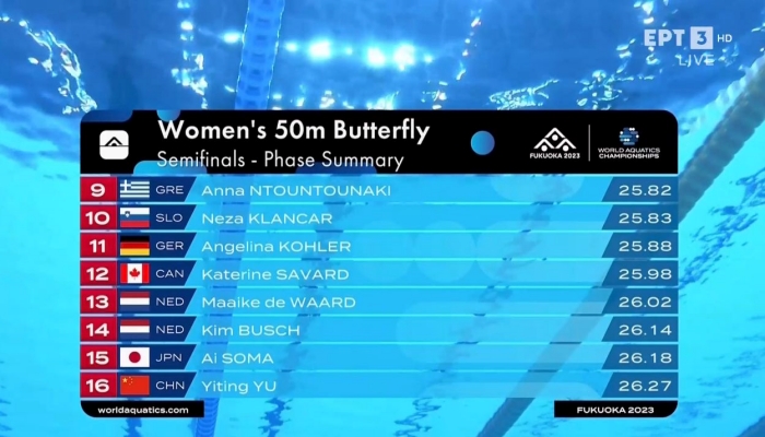 Άτυχη η Άννα Ντουντουνάκη στα ημιτελικά των 50μ. πεταλούδα γυναικών του Παγκοσμίου Πρωταθλήματος υγρού στίβου της Φουκουόκα, αφού έμεινε εκτός τελικού για 5 εκατοστά του δευτερολέπτου.