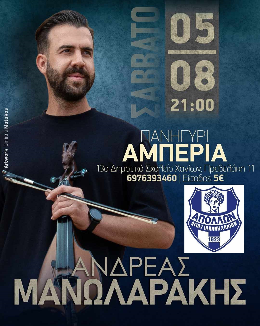 Το ερχόμενο Σάββατο 5/8 θα πραγματοποιηθεί ο χορός του Απόλλωνα Αγίου Ιωάννη στην Αμπεριά με το συγκρότημα του Ανδρέα Μανωλαράκη