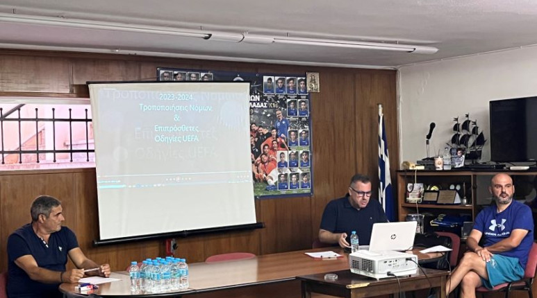 Την ενημέρωση των σωματείων, για τις αλλαγές που προέκυψαν στους Κανονισμούς, για την αγωνιστική περίοδο 2023-24,ανέλαβαν ο Πρόεδρος της Επιτροπής Διαιτησίας Γιώργος Τριανταφύλλους και τα μέλη Γιάννης Δοκιμάκης και Μανόλης Μαρνέζος.
