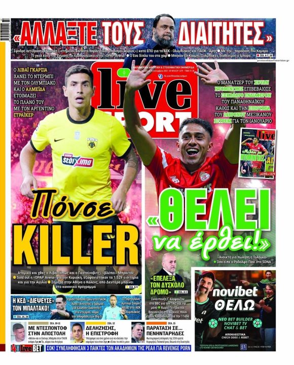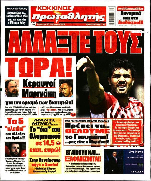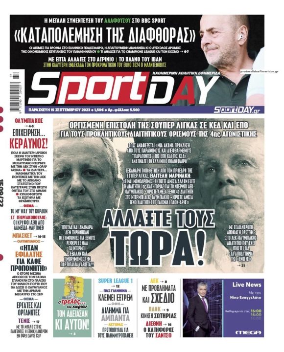 Τα αθλητικά πρωτοσέλιδα της Παρασκευής 15 Σεπτεμβρίου