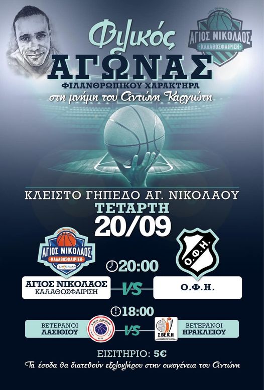 Την Τετάρτη 20/9 στις 20:00 στο κλειστό γήπεδο Αγίου Νικολάου στο Λασίθι, θα πραγματοποιηθεί ένα ξεχωριστό φιλικό μπάσκετ ανάμεσα στον τοπικό Άγιο Νικόλαο και τον ΟΦΗ. Θα είναι στη μνήμη του Αντώνη Καργιώτη που δολοφονήθηκε στο λιμάνι του Πειραιά το βράδυ της Τρίτης 5 Σεπτεμβρίου.