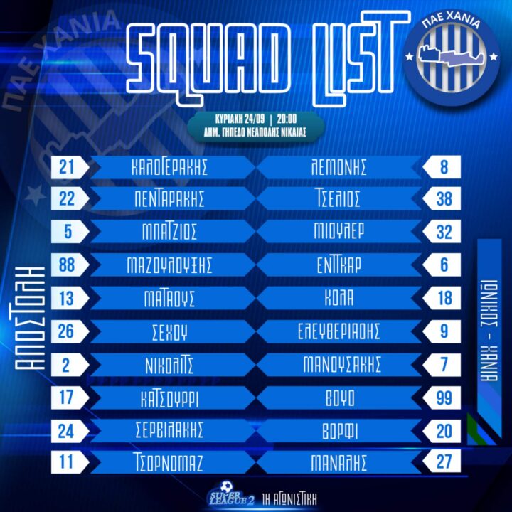 Αναλυτικά οι ποδοσφαιριστές που θα έχει στη διάθεσή του ο Γιάννης Ταουσιάνης είναι οι: Καλογεράκης, Πενταράκης, Ματάους, Μπάτζιος, Σέχου, Μαζουλουξής, Κατσούρρι, Νίκολιτς, Σερβιλάκης, Λεμονής, Τσορνομάζ, Τσέλιος, Εντγκαρ, Μιούλερ, Ελευθεριάδης, Κόλα, Μανουσάκης, Μάναλης, Βουό, Βόρφι