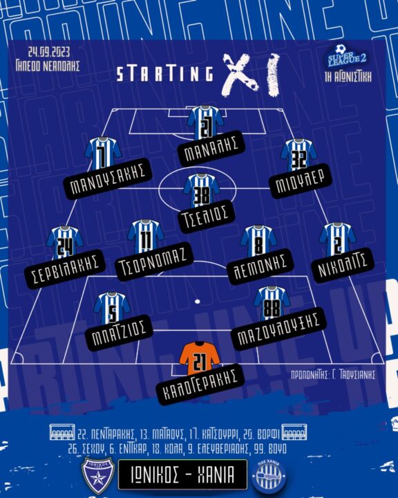 Ιωνικός (Γιώργος Σίμος): Κότνικ, Τσιριγώτης (54’ Καντσόλα), Ντε Βινσέντι (71′ Ντάουντα), Οικονομίδης, Γιακουμάκης (54’ Λινάρδος), Γκοράνοβ, Ιγκλέσιας, Ζοάο Πέδρο (80′ Σερπέζης), Γκίνη, Τζανακάκης, Μίκο