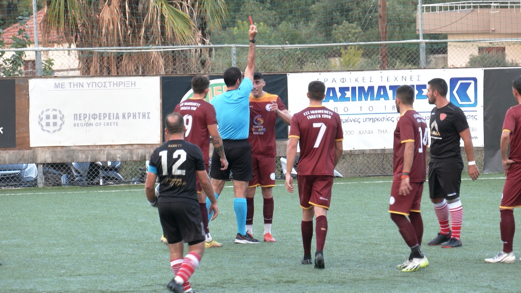 Στο 15′ ο Αρτσιδάκης θα κάνει φάουλ στον Νεκτάριο Βαρουξάκη ο οποίος τον είχε βάλει πλάτη και βρισκόταν ένα βήμα έξω απο την περιοχή προ του Καζά. Ο κ. Χρυσός έδειξε την απευθείας κόκκινη κάρτα αφήνοντας με 10 παίκτες τον Ίκαρο. Το φάουλ εκτέλεσε ο Γιάννης Βαρουξάκης ο οποίος έγραψε το 0-1 με δυνατό σουτ.