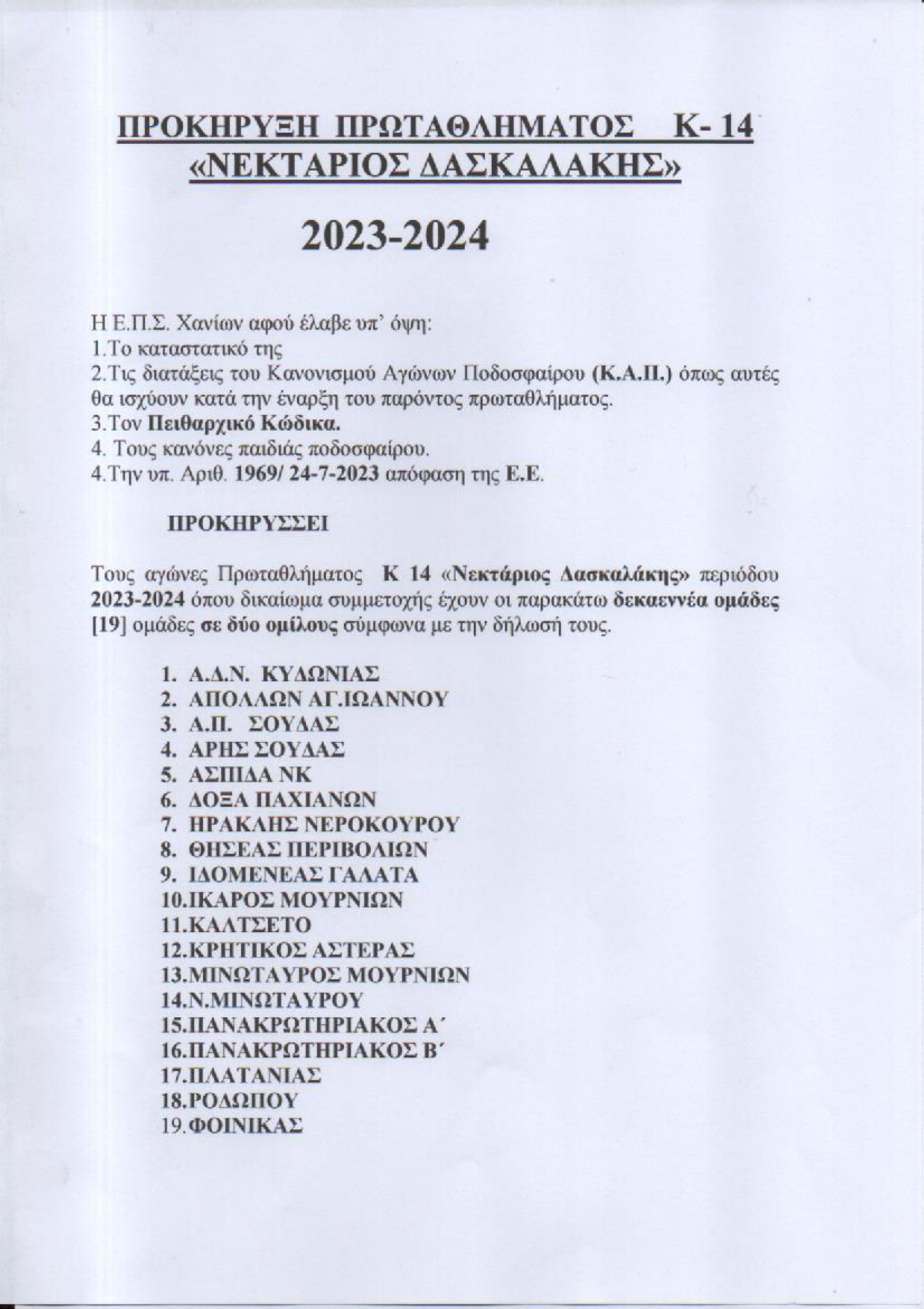 Πρεμιέρα το Σάββατο στις 4/11 για το πρωτάθλημα των Κ14 της Ένωσης Ποδοσφαιρικών Σωματείων Χανίων.