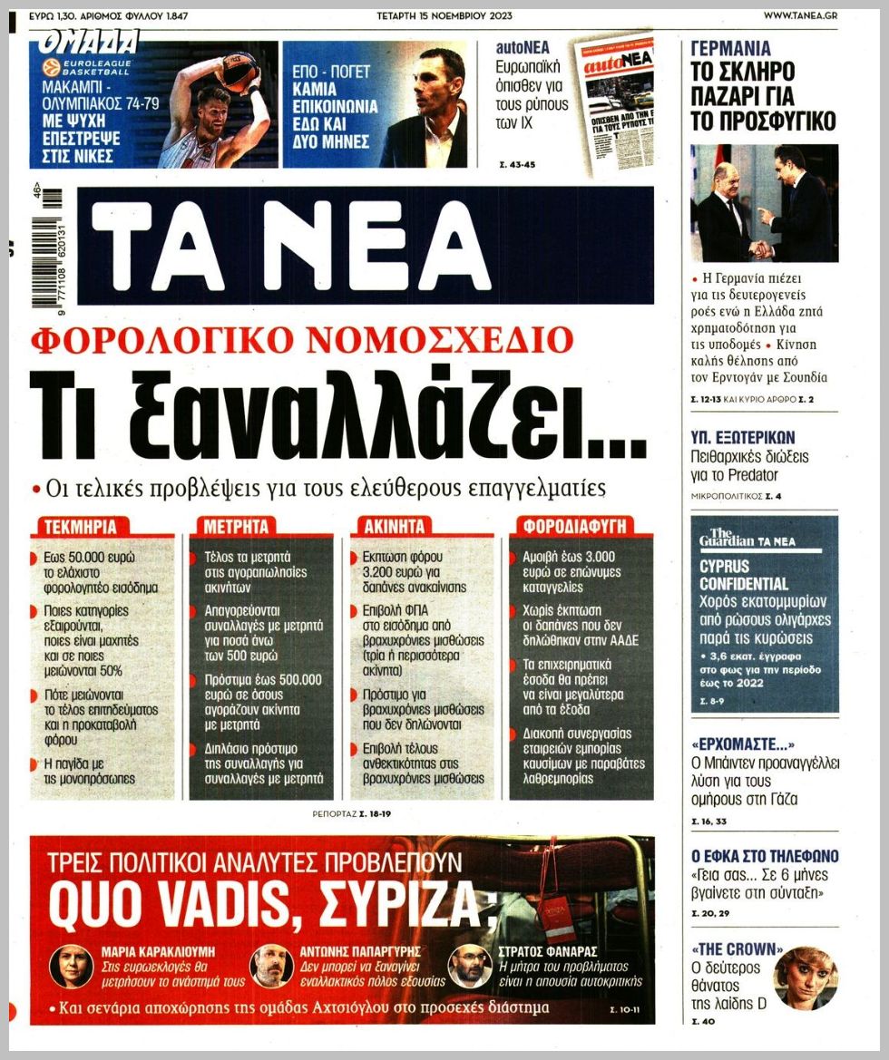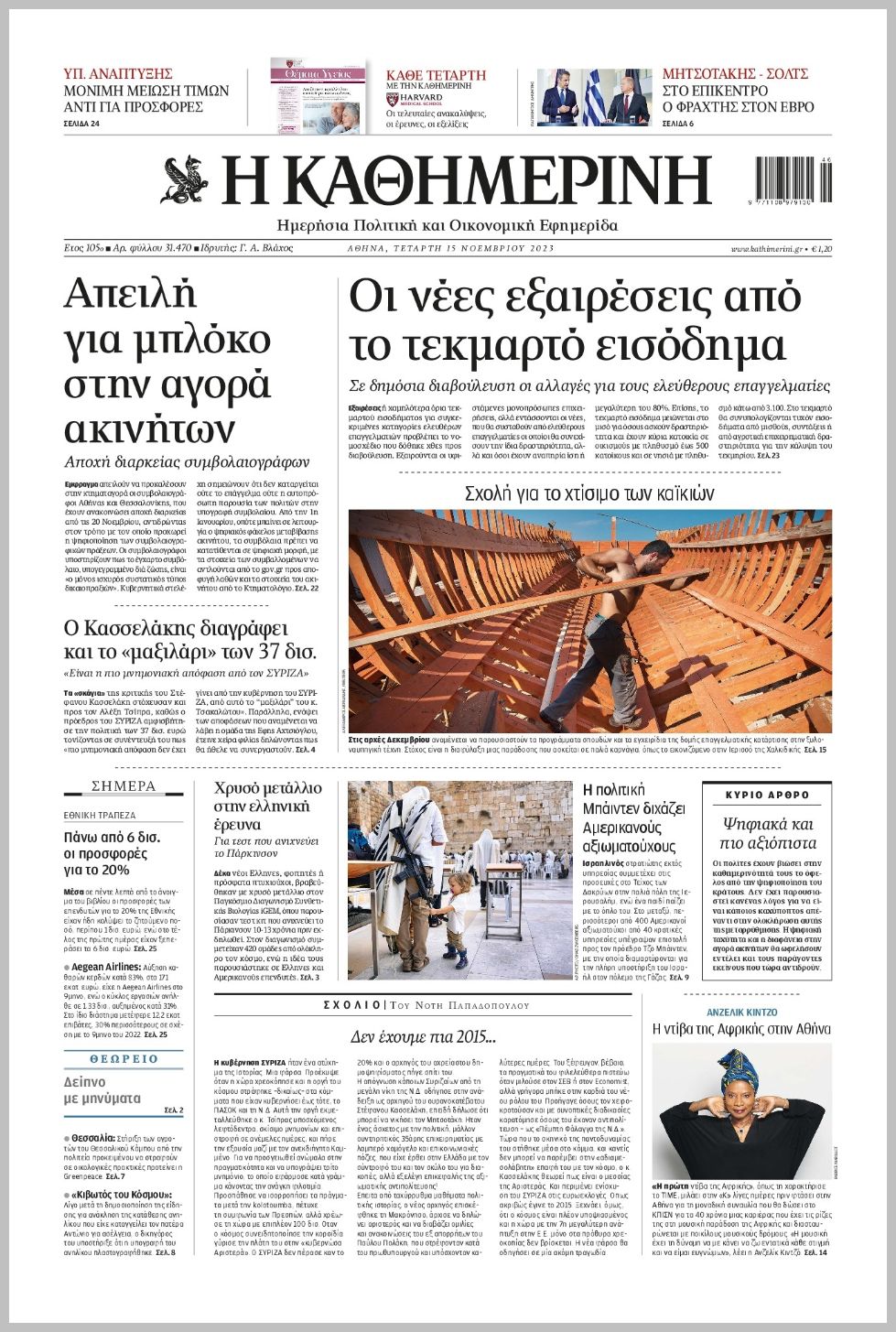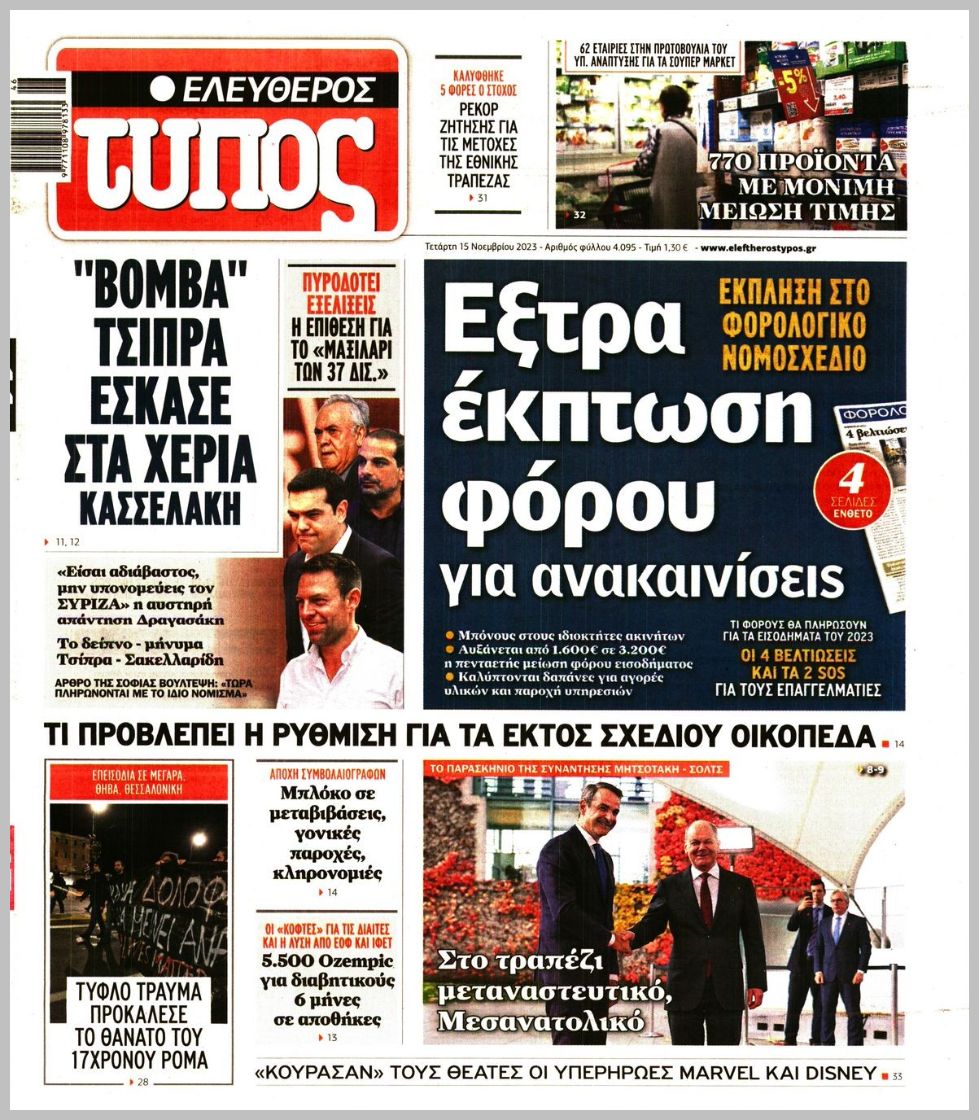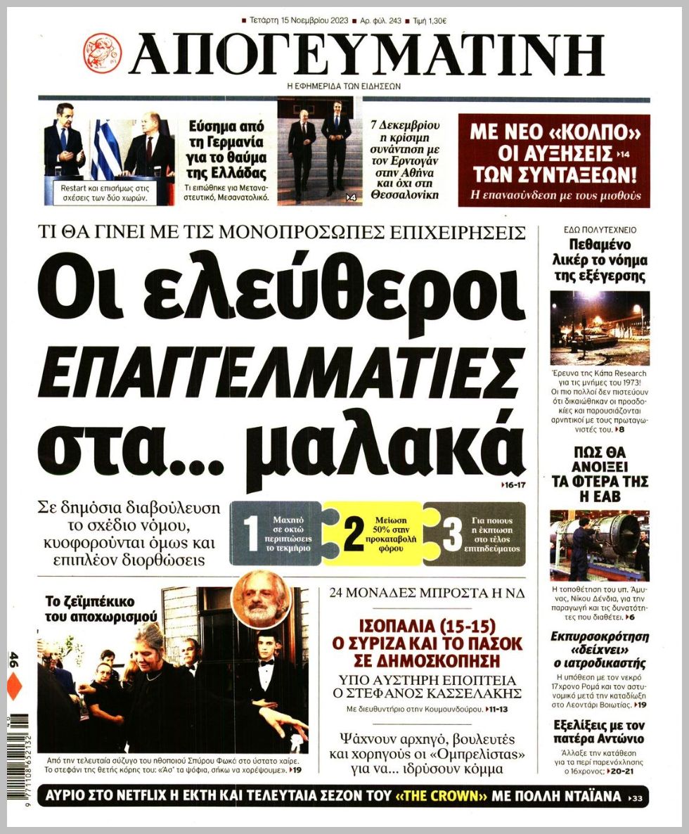 Τα πρωτοσέλιδα των πολιτικών εφημερίδων της Τετάρτης (15/11)