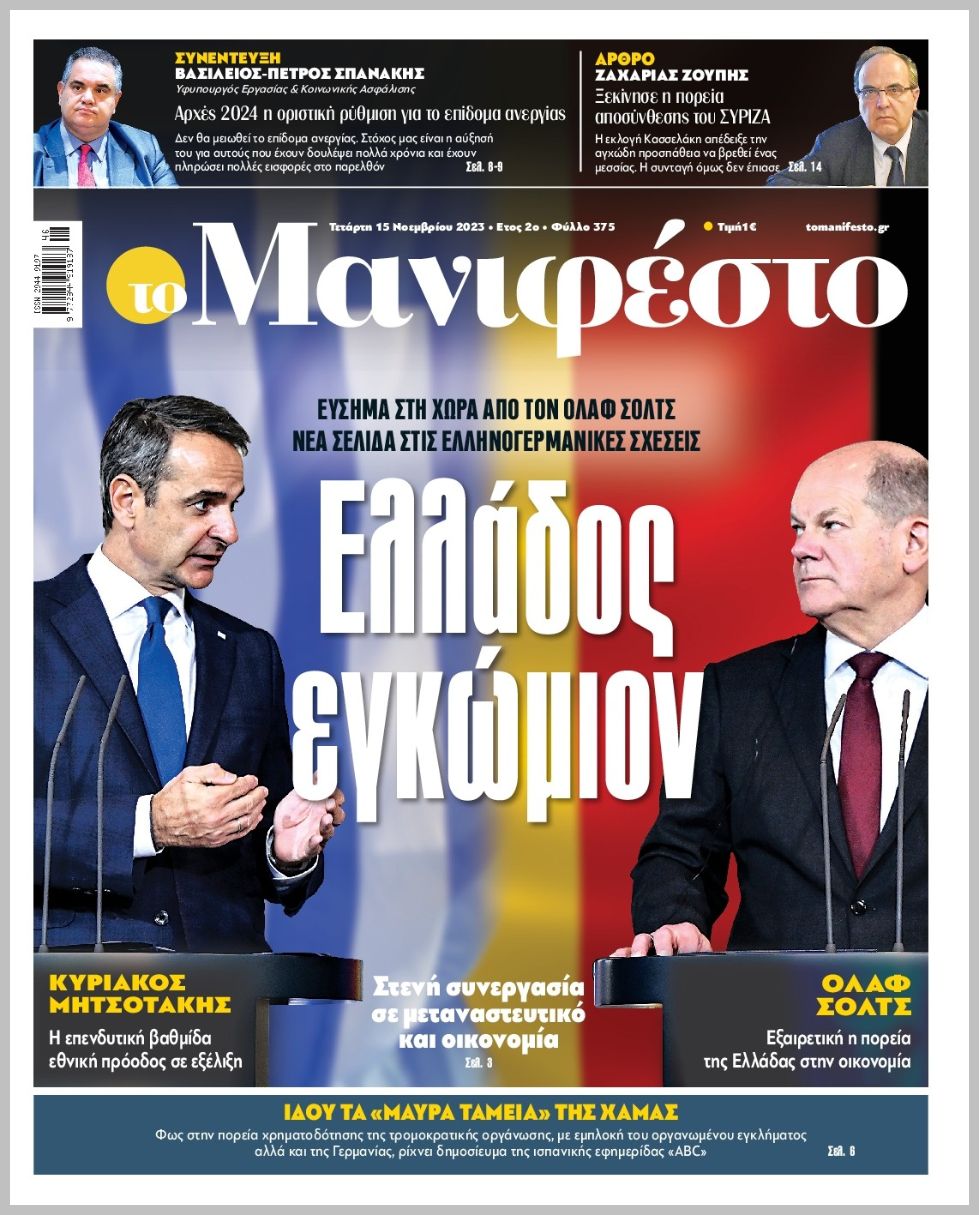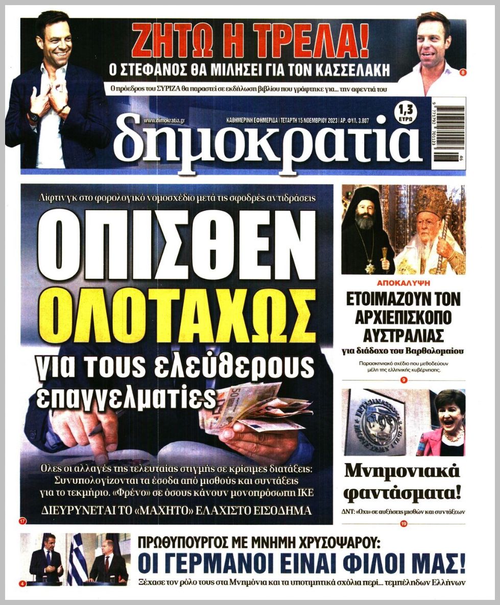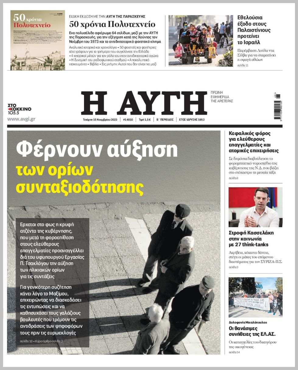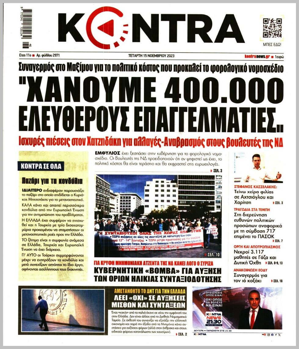 Τα πρωτοσέλιδα των πολιτικών εφημερίδων της Τετάρτης (15/11)