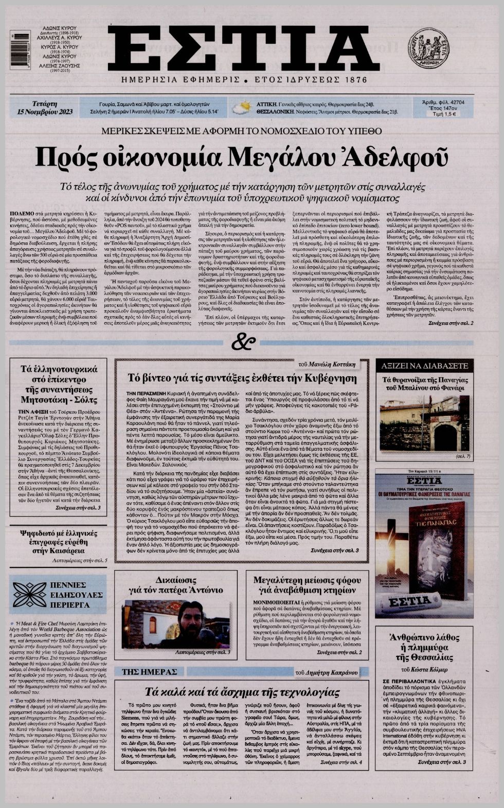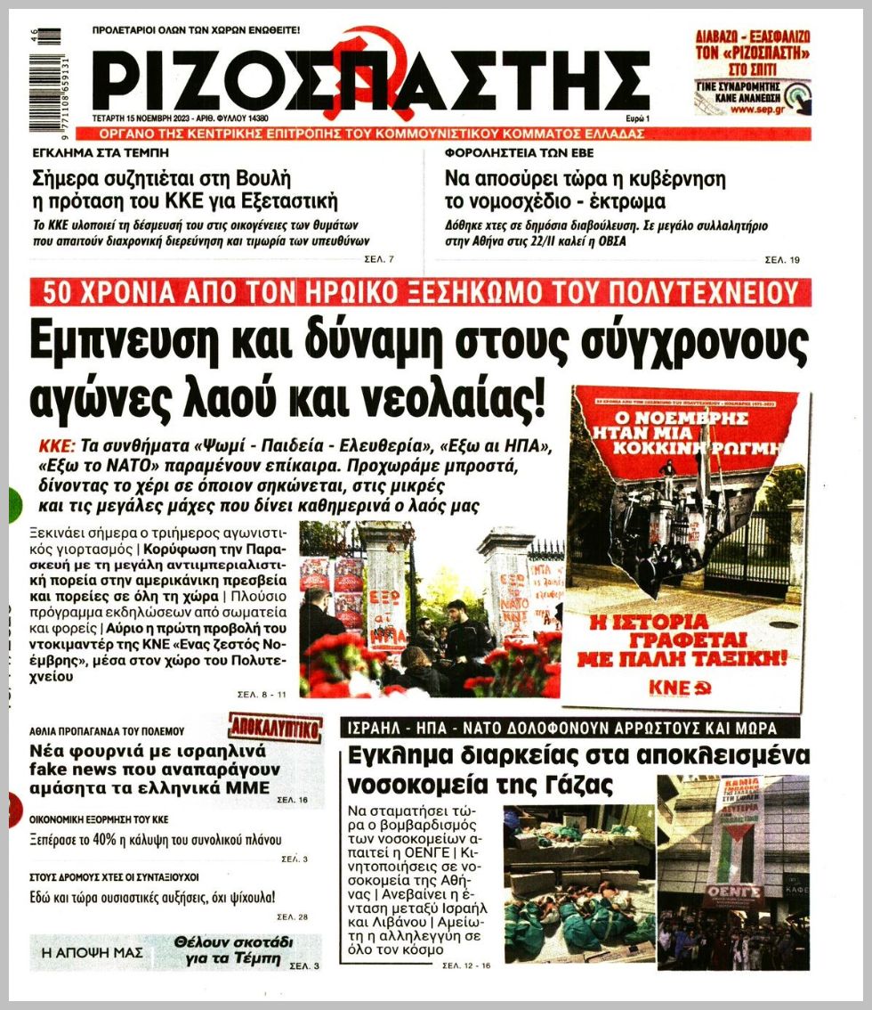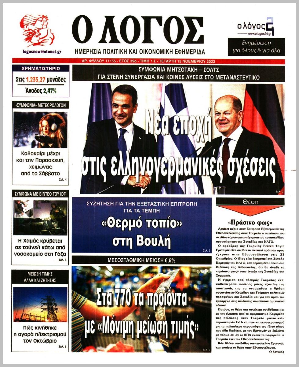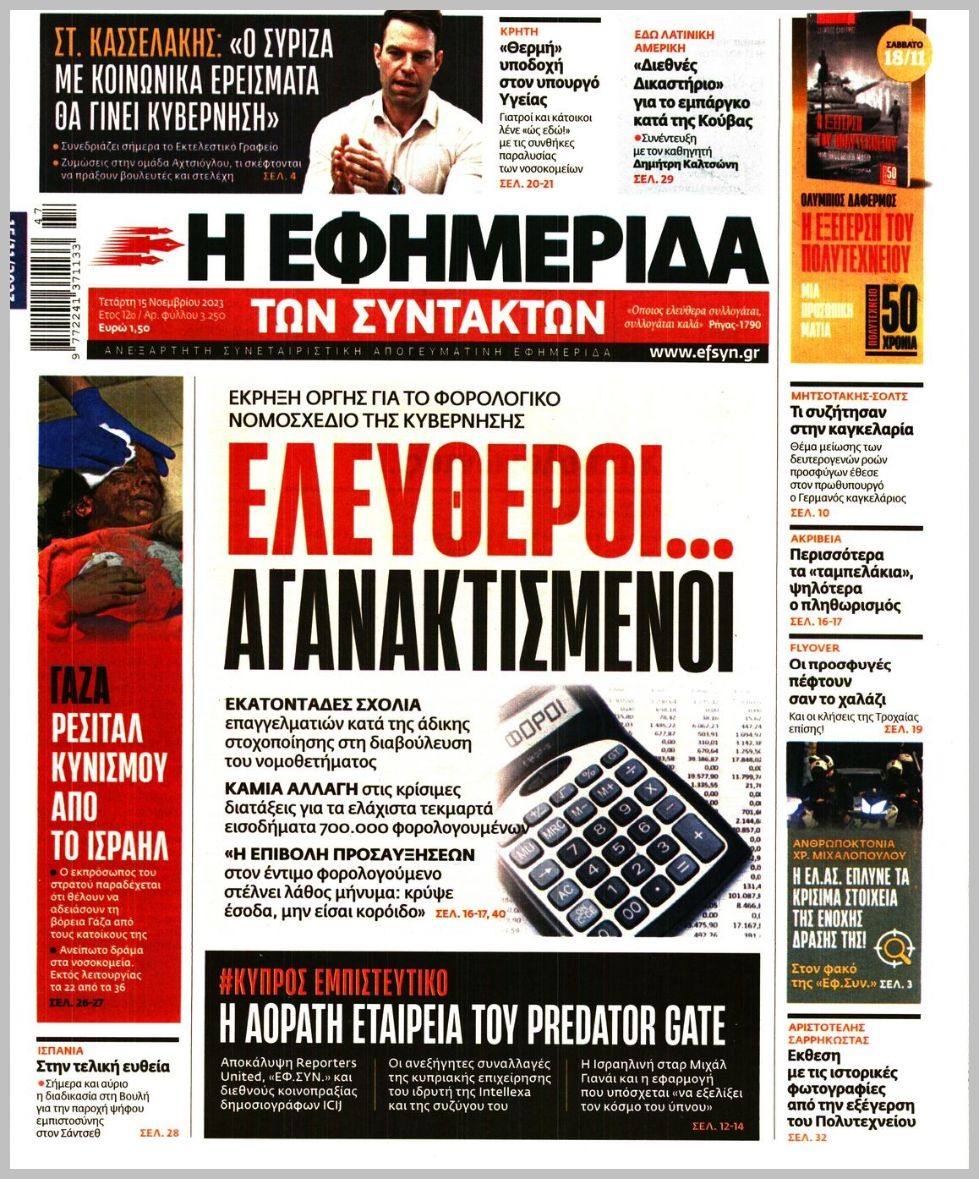 Τα πρωτοσέλιδα των πολιτικών εφημερίδων της Τετάρτης (15/11)