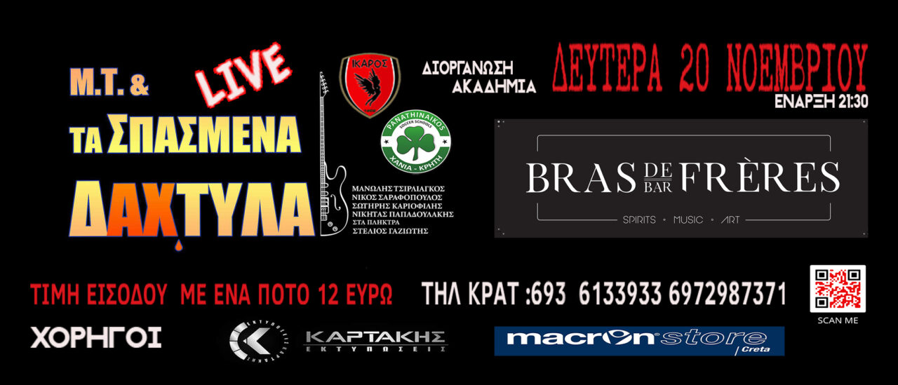 Η εκδήλωση θα πραγματοποιηθεί στο Bras de Frères και θα ξεκινήσει στις 21.30 το βράδυ στο live που διοργανώνεται από τους επικεφαλής της σχολής ποδοσφαίρου και όπως λένε και οι διοργανωτές θα… “παίξουν μπαλίτσα” με τις νότες των Μανώλη Τσιρλιάγκου, Νίκου Σαραφόπουλου, Σωτήρη Καριοφίλη, Νικήτα Παπαδουλάκη ενώ στα πλήκτρα θα βρίσκεται ο Στέλιος Γαζιώτης.