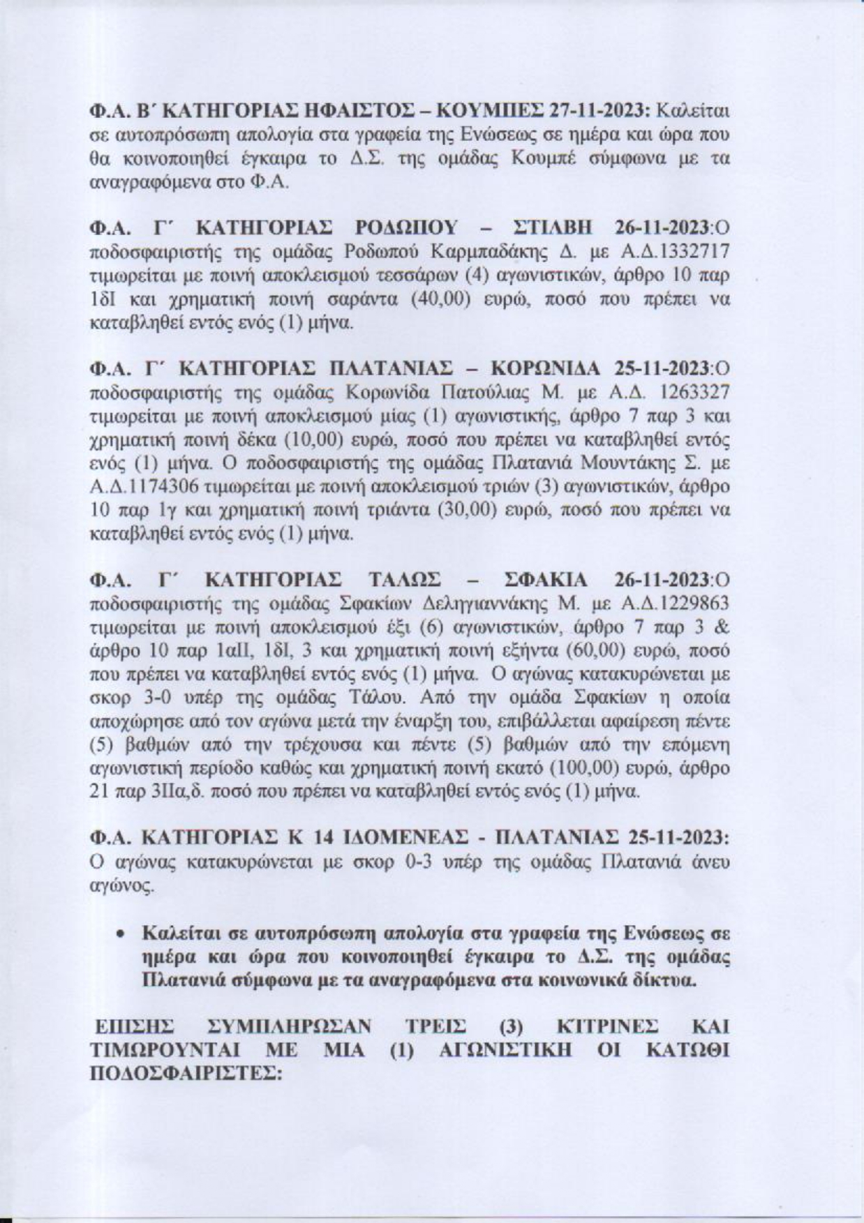 Βαριά ήταν η τιμωρία της ομάδας των Σφακίων για την αποχώρηση της από το παιχνίδι με τον Τάλω καθώς της αφαιρέθηκαν 5 βαθμοί από το φετινό πρωτάθλημα και άλλοι 5 από το επόμενο.