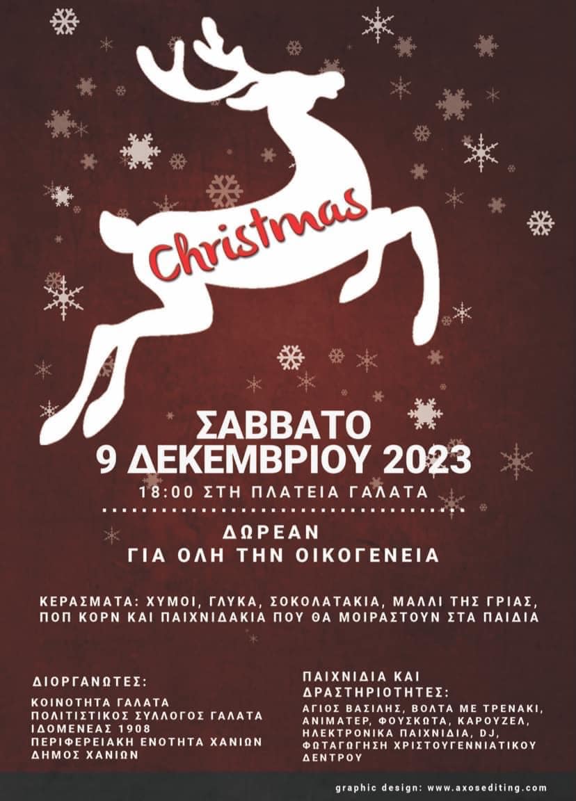 Η εκδήλωση που πρόκειται να ξεκινήσει στις 6.00 το απόγευμα στην Πλατεία Γαλατά ενώ περιλαμβάνονται παιχνίδια και δραστηριότητες ενώ θα γίνει και η φωταγωγήση Χριστουγεννιατικού δέντρου.