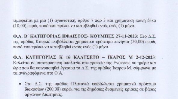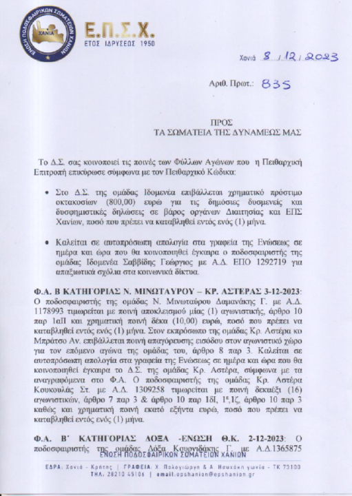Παράλληλα, ο Ιδομενέας τιμωρήθηκε με 800 ευρώ πρόστιμο για «δυμόσιες δυσμενείς και δυσφημιστικές δηλώσεις σε βάρος οργάνων Διαιτησίας και ΕΠΣ Χανίων».