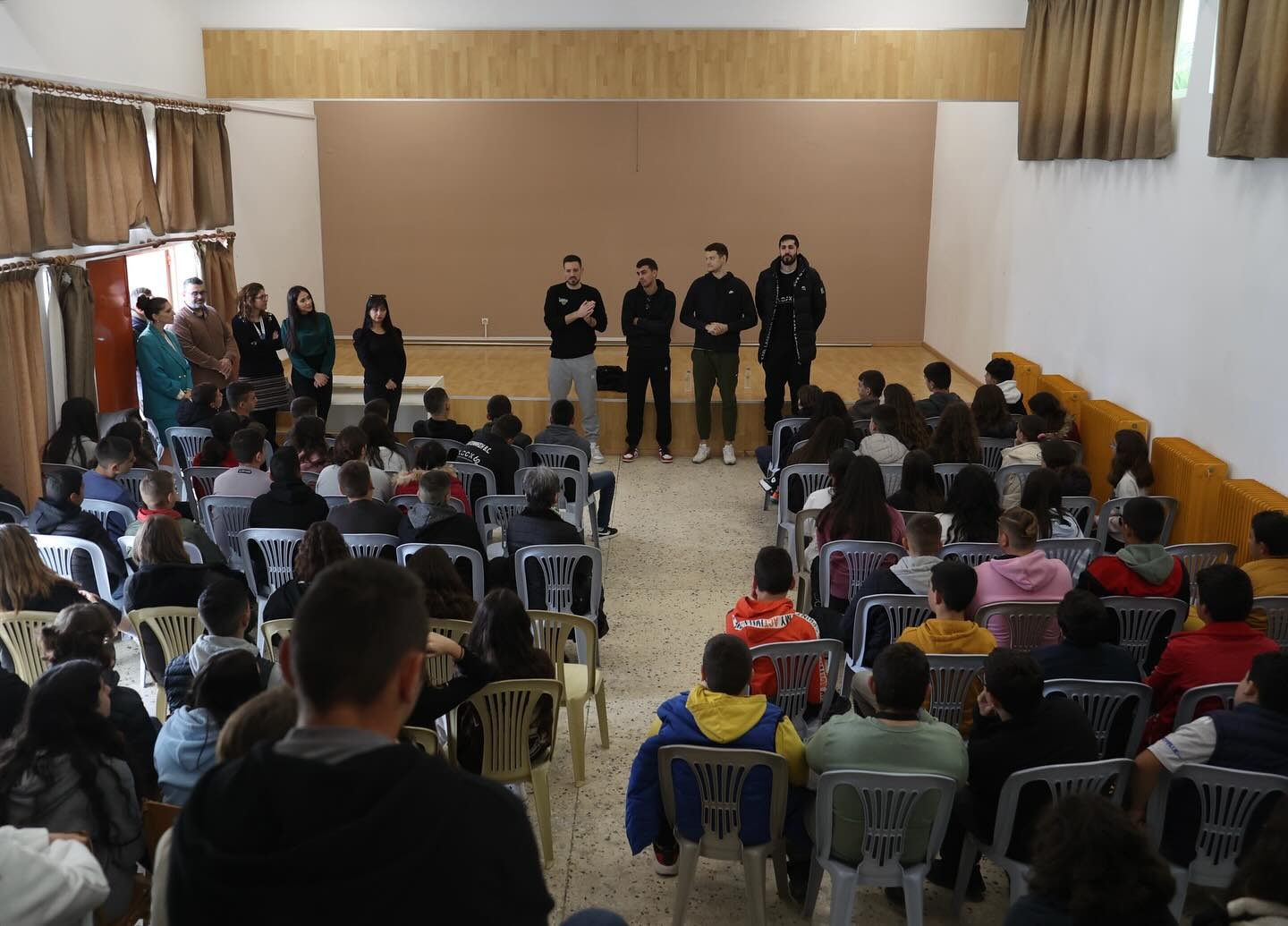 Συγκεκριμένα οι παίκτες της ομάδας Μιλοβαν Ντρασκοβιτς, Κριστοφερ Ραζής, Ντουσας Βιντσεντις και Κωστα Οικονομόπουλος επισκέφτηκαν στο Γυμνάσιο Αρκαλοχωρίου και μίλησαν για τα οφέλη του αθλητισμού, τις δεξιότητες που σου προσφέρει η ενασχόληση με κάποιου είδους άθλημα αλλά και η ανάπτυξη της προσωπικότητας και της κοινωνικότητας συμμετέχοντας σε κάποια ομάδα.
