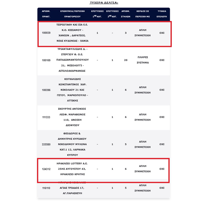 Την ίδια ώρα, ένα από τα έξι τυχερά πεντάρια “‘έπεσε” στο Ηράκλειο και ειδικότερα σε πρακτορείο ΟΠΑΠ επί της 25ης Αυγούστου, στο κέντρο της πόλης.