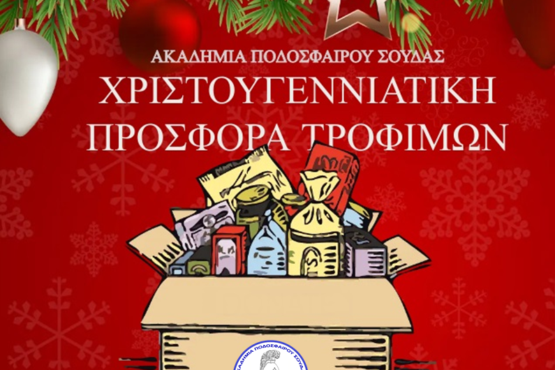 Η Ακαδημία Ποδοσφαίρου Σούδας λόγω των ημερών των Χριστουγέννων πήρε την πρωτοβουλία για τη συγκέντρωση τροφίμων μακράς διαρκείας τα οποία θα διατεθούν στο Κοινωνικό Παντοπωλείο του Δήμου Χανίων.