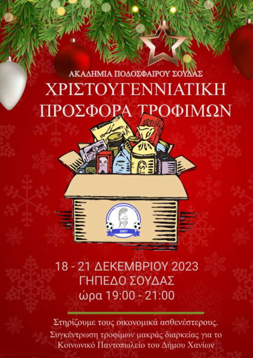 Η συγκέντρωση τροφίμων θα γίνεται στο Γήπεδο της Σούδας στο γραφείο της Ακαδημίας από Δευτέρα 18 έως Πέμπτη 21 Δεκεμβρίου 2023 (19:00 – 21:00).