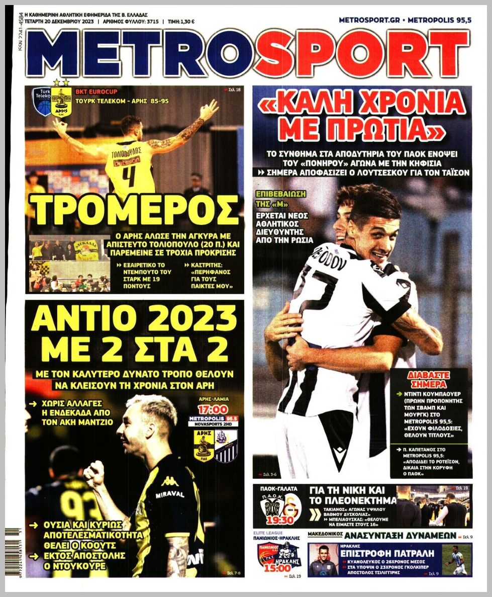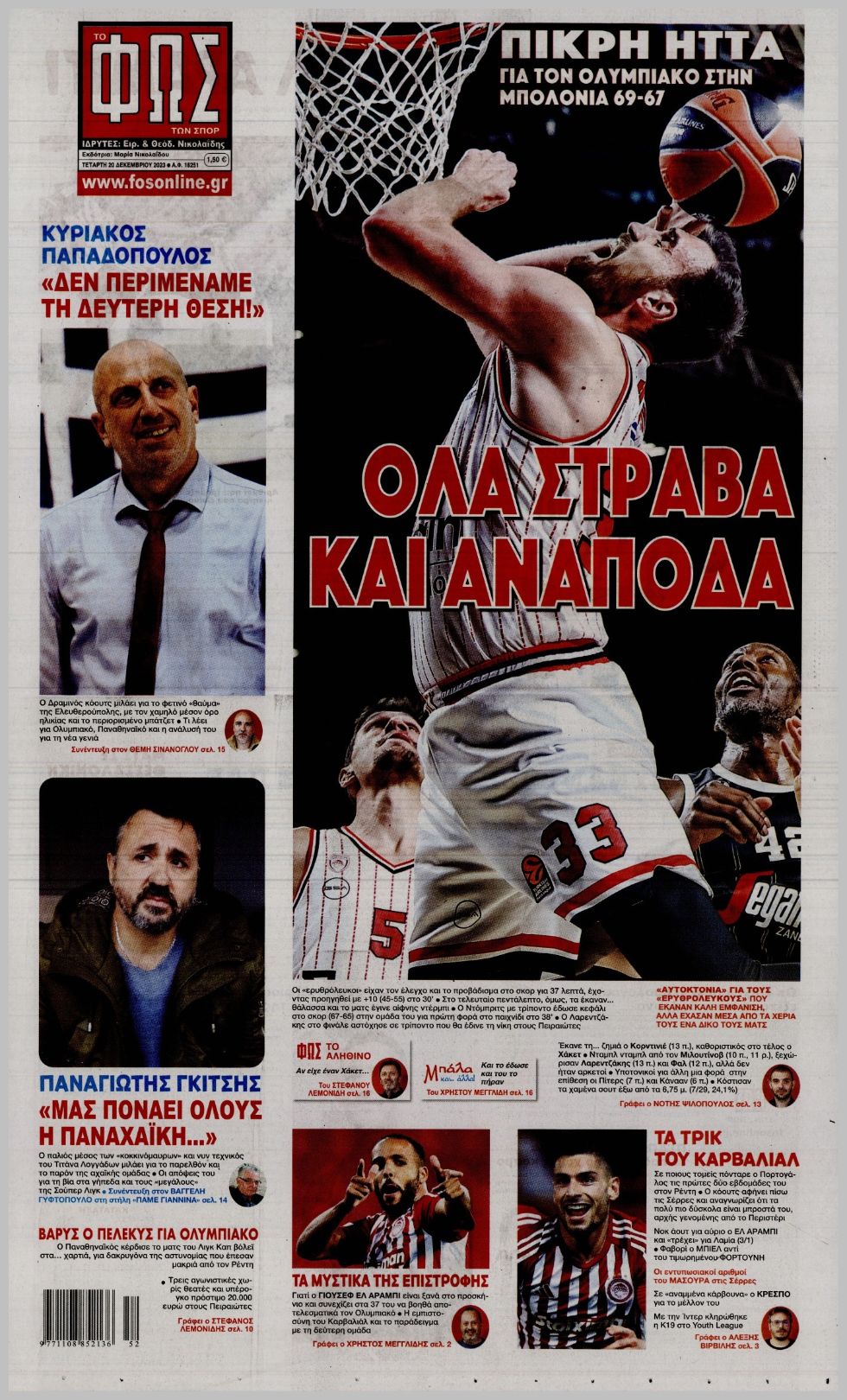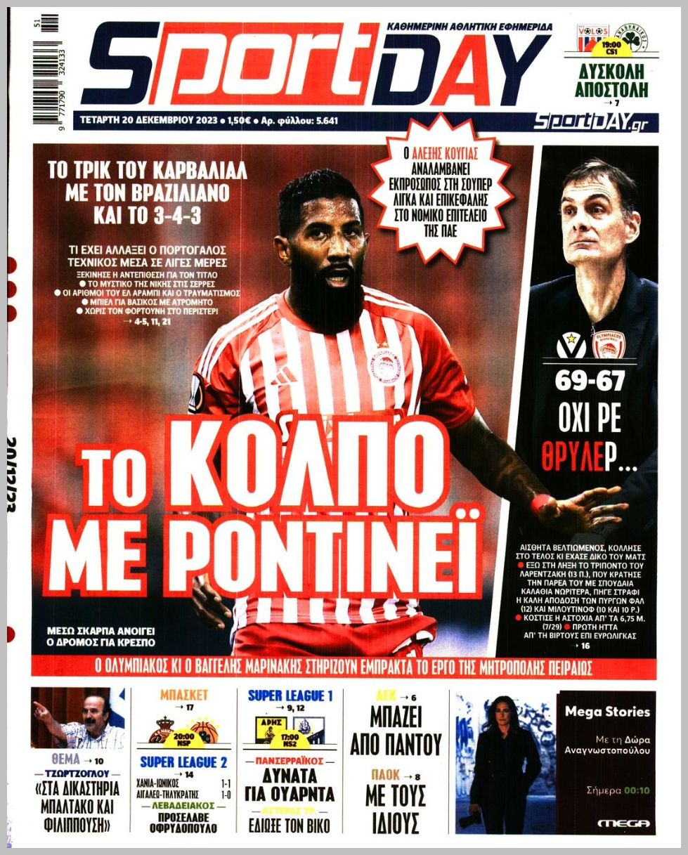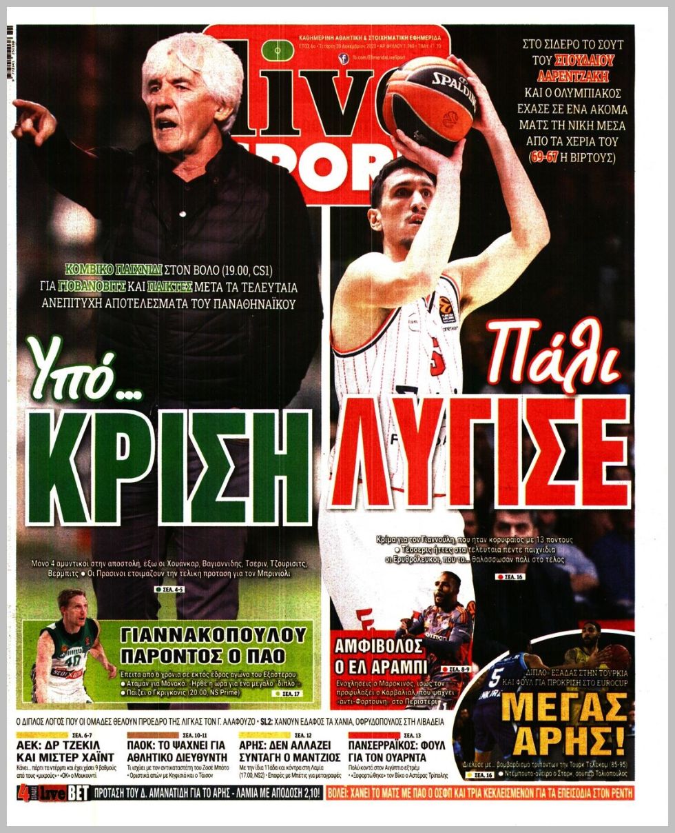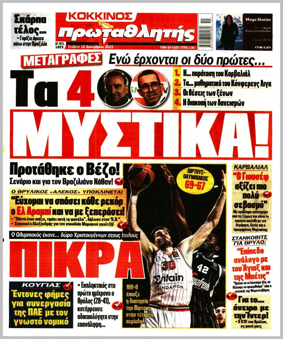 Τα αθλητικά πρωτοσέλιδα της Τετάρτης (20/12)