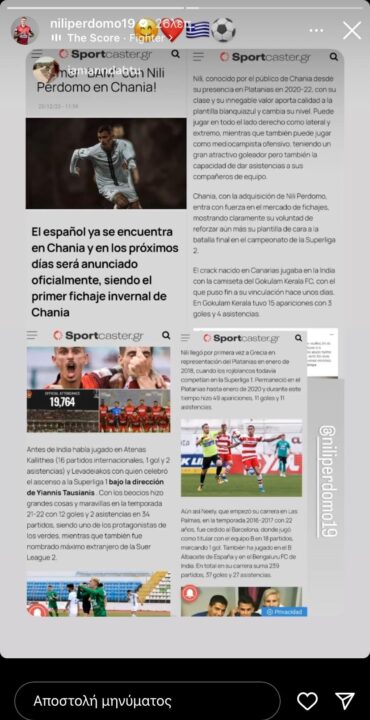 Ο Νίλι Περντόμο επιβεβαίωσε το αποκλειστικό ρεπορτάζ του sportscaster.gr, αναρτώντας το δημοσίευμα που τον… φέρνει στα Χανιά στον προσωπικό του λογαριασμό στο Instagram!