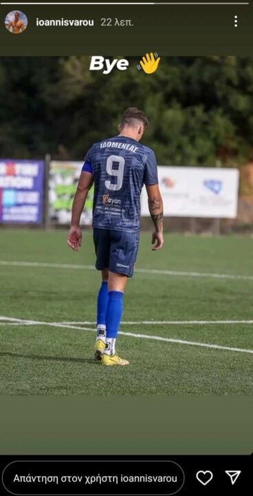 Αινιγματική ανάρτηση από τον Γιάννη Βαρουξάκη στον προσωπικό του λογαριασμό στο Instagram, καθώς ο επιθετικός του Ιδομενέα φαίνεται ότι αποχωρεί από την ομάδα του Γαλατά. Πιο συγκεκριμένα, ο πρώτος σκόρερ του πρωταθλήματος της Α ΕΠΣ Χανίων με 14 γκολ δημοσίευσε ένα story στο Instagram στο οποίο γράφει «bye», φορώντας την φανέλα του Ιδομενέα και όπως όλα δείχνουν αποχωρεί από την ομάδα.