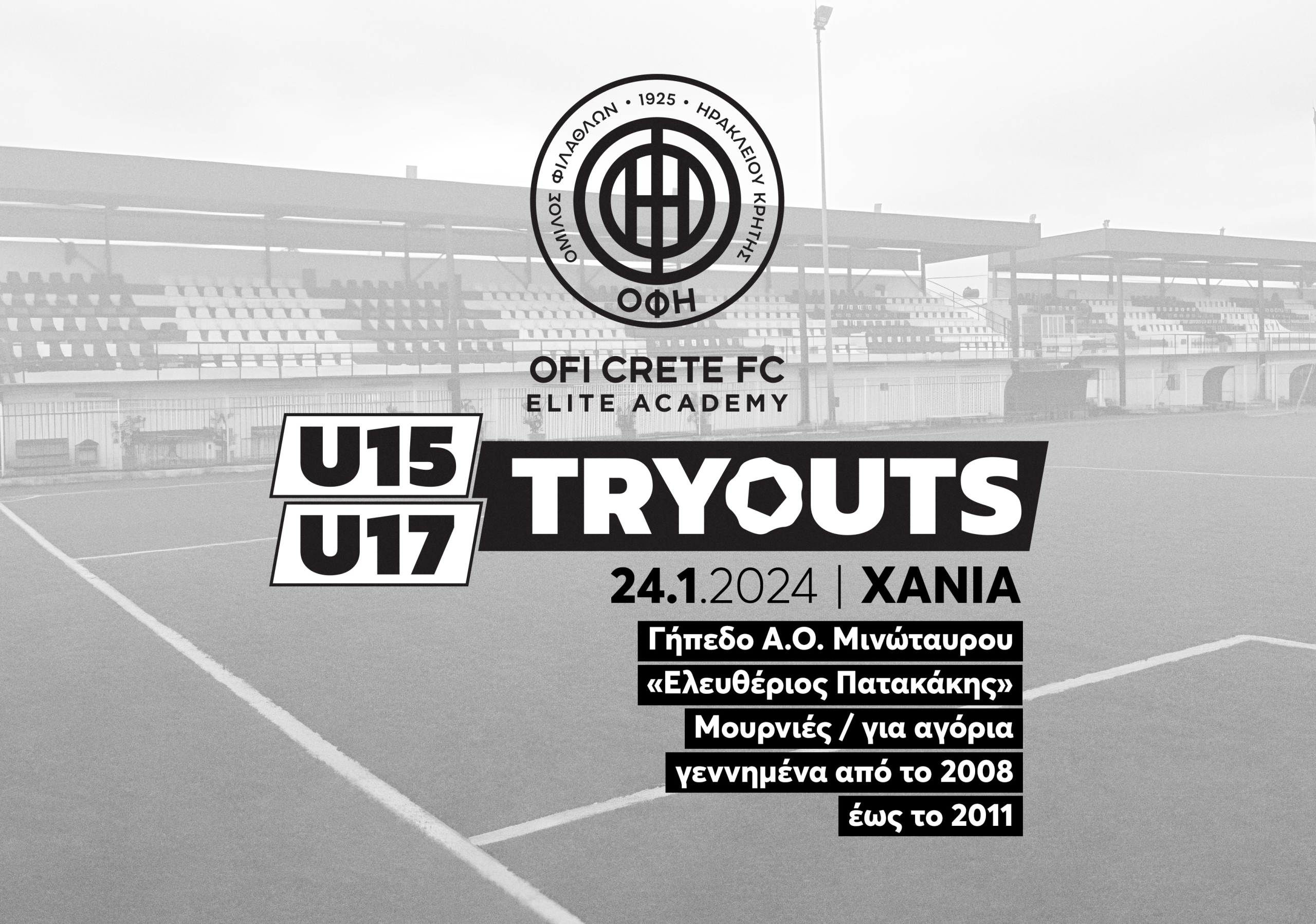 Η ΠΑΕ ΟΦΗ 1925, διοργανώνει δοκιμαστικές προπονήσεις (tryouts) την Τετάρτη 24/1 στα Χανιά, για την επιλογή νεαρών ποδοσφαιριστών που θα στελεχώσουν τις ομάδες Κ15 και Κ17 της Elite Ακαδημίας, για την σεζόν 2024-25.