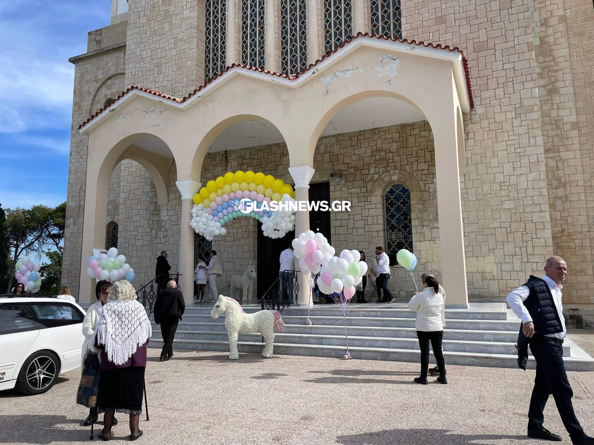 Μπαλόνια με μηνύματα για την Ραφαέλα και ένα μεγάλο ουράνιο τόξο στόλιζαν το ναό.