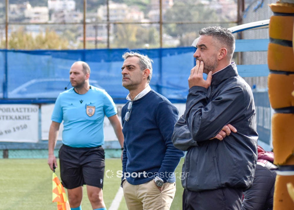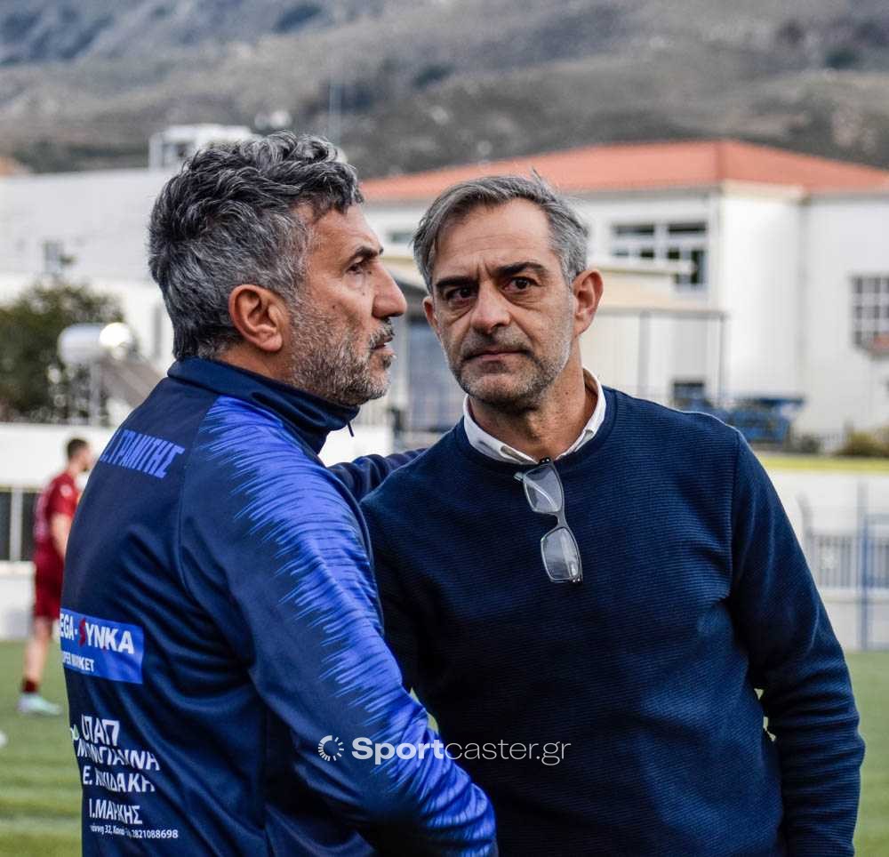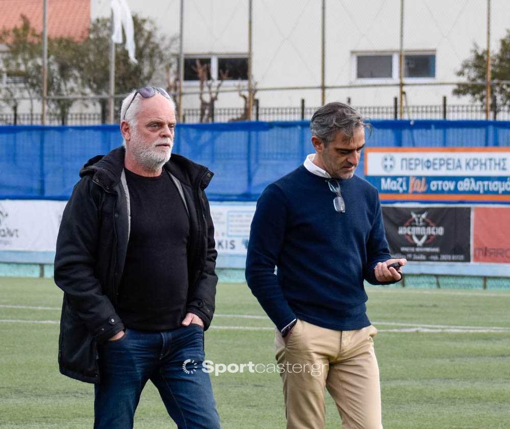 Η αγωνία ήταν έκδηλη στον πάγκο του Άρη Σούδας, προσηλωμένοι στο “έργο” τους Κανελάκης και Μαρκετάκης