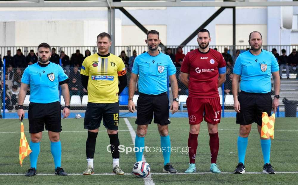 Οι διαιτητές Γιαννουλάκης Πέτσας και Μαρκετάκης με τους αρχηγούς Πατρικάκης (Γρανίτη) και Παπαθανασίου (Άρης Σούδας)