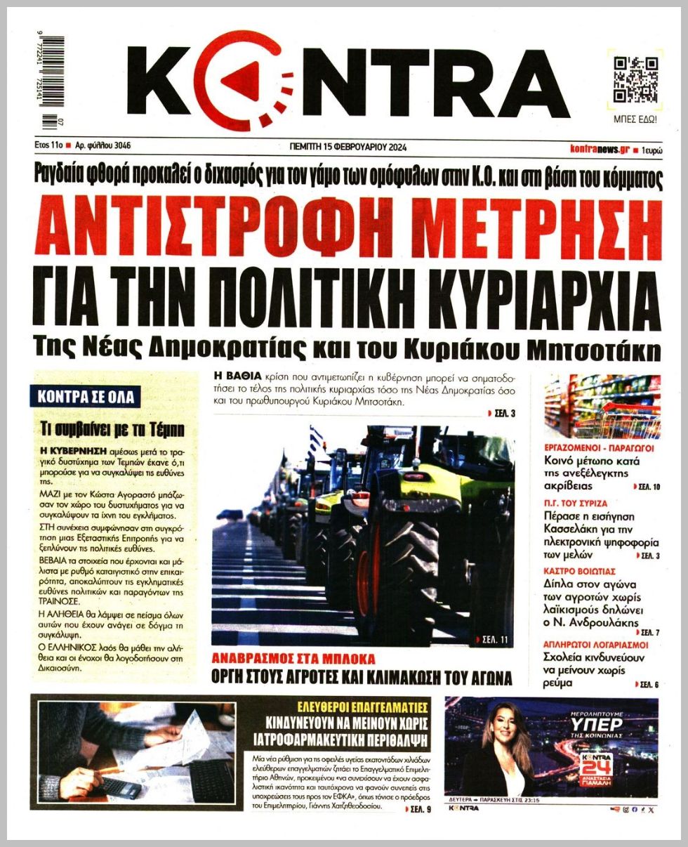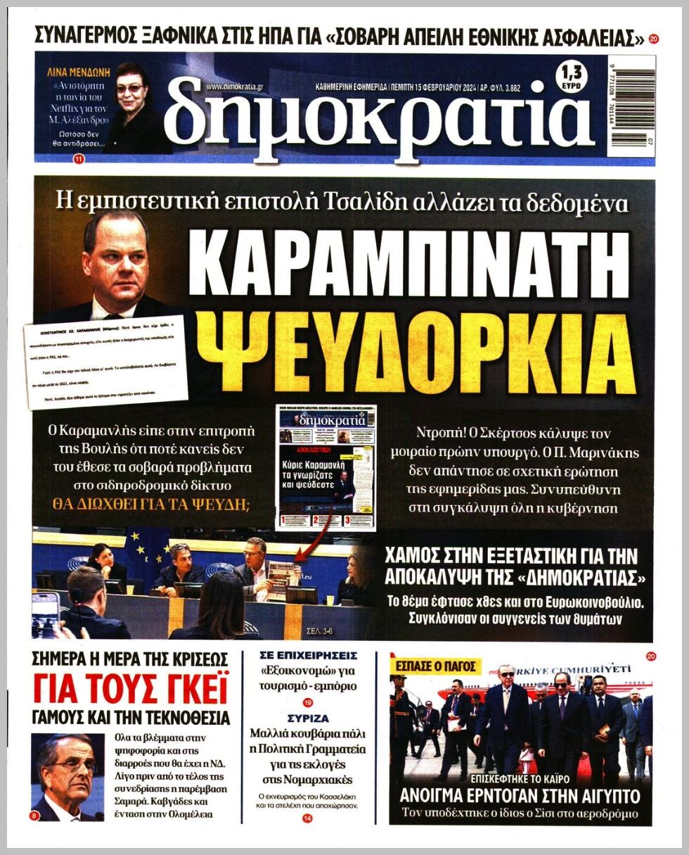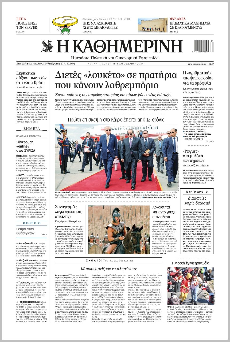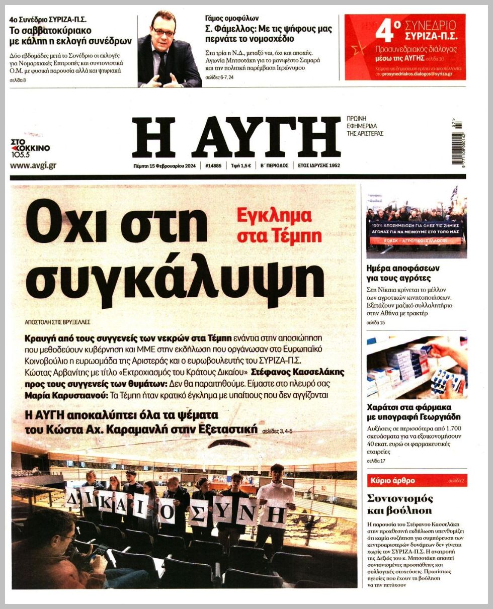 Τα πρωτοσέλιδα των πολιτικών εφημερίδων της Πέμπτης (15/2)