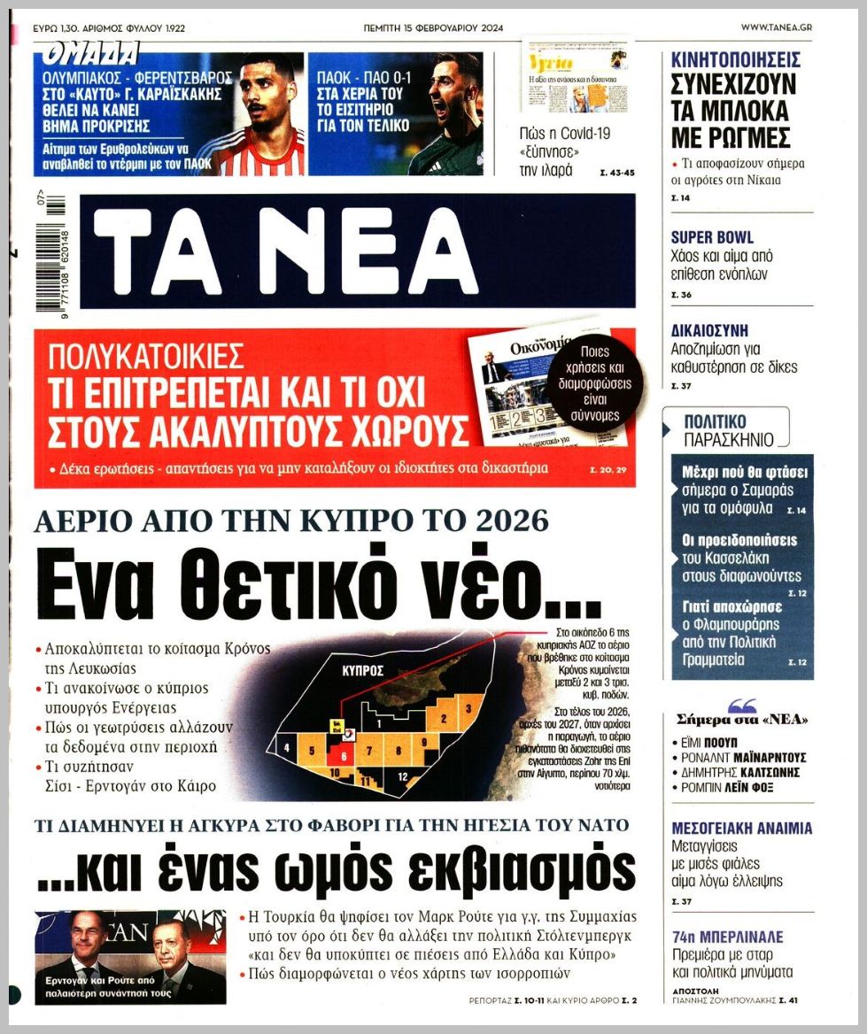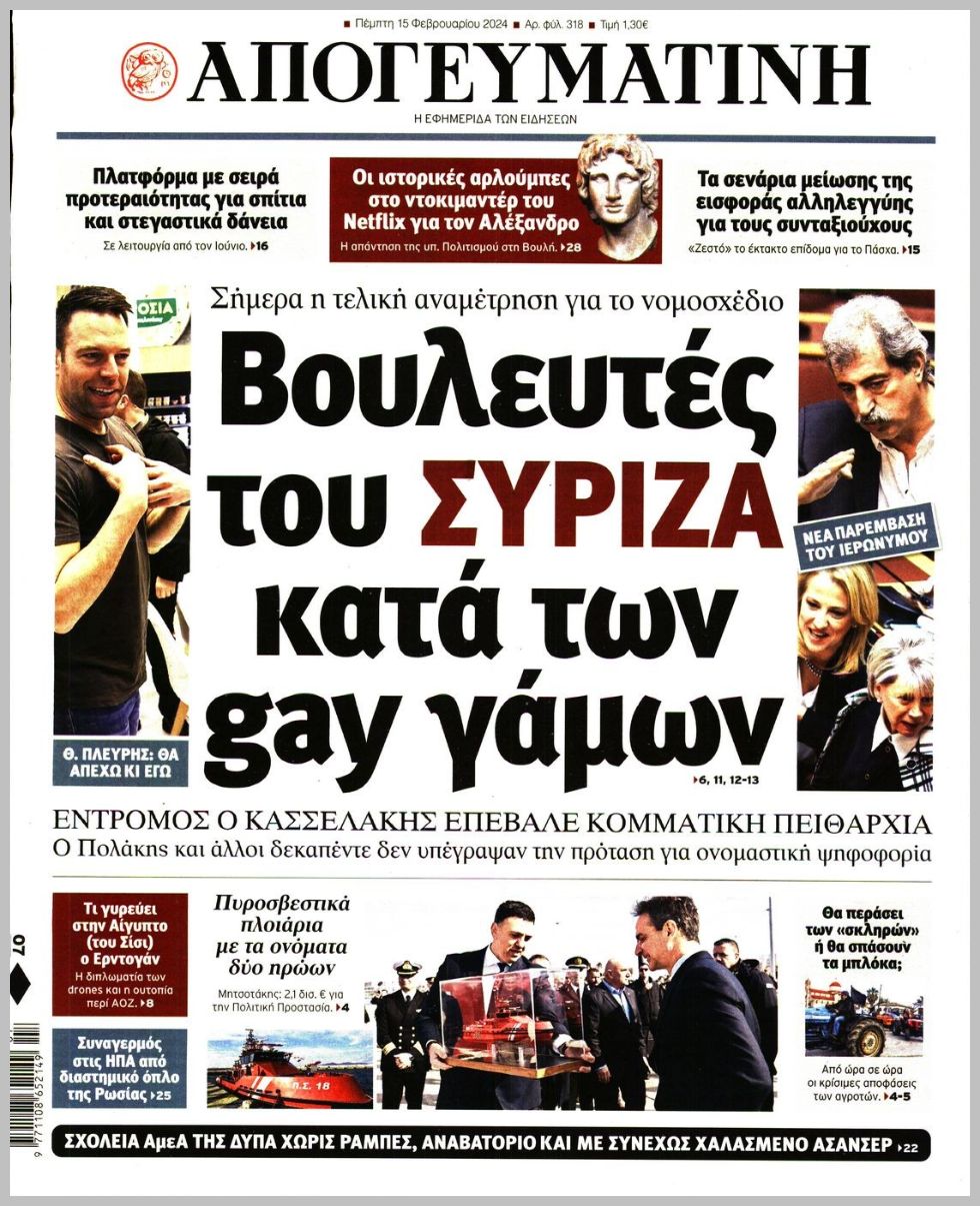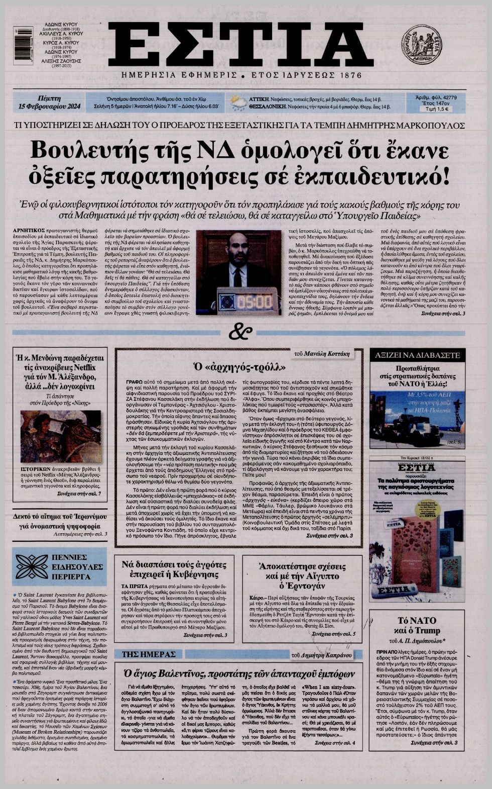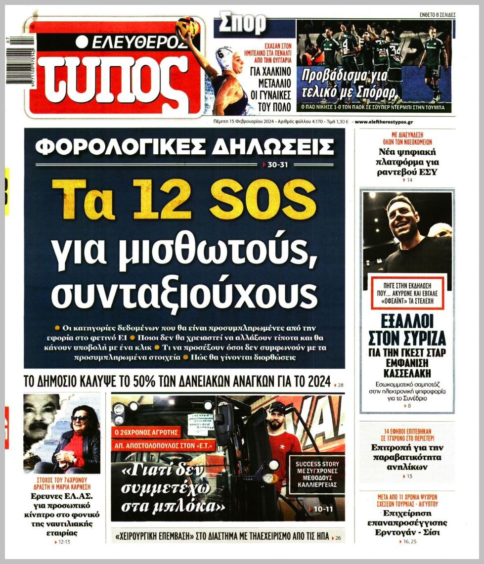 Τα πρωτοσέλιδα των πολιτικών εφημερίδων της Πέμπτης (15/2)