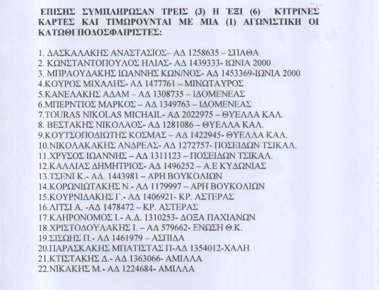 22 ποδοσφαιριστές συμπλήρωσαν τρεις ή έξι κίτρινες κάρτες με αποτέλεσμα να μην έχουν δικαίωμα συμμετοχής στα παιχνίδια των τοπικών πρωταθλημάτων.