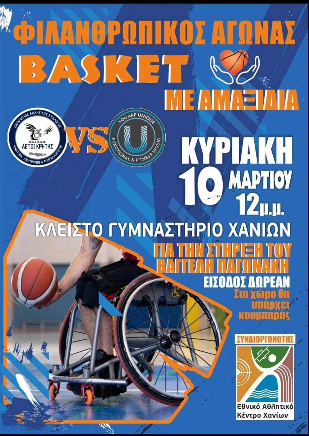 Φιλανθρωπικός αγώνας μπάσκετ με αμαξίδια θα πραγματοποιηθεί την Κυριακή 10 Μαρτίου όπου θα υπάρχει κουμπαράς για την οικονομική στήριξη του Βαγγέλη Παγωνάκη.