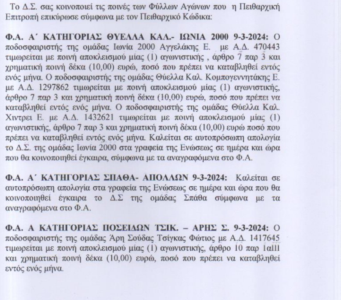 Α' ΕΠΣΧ Ανακοινώθηκαν οι ποινές της Πειθαρχικής Επιτροπής Published Πριν 2 έτη on 13 Μαρτίου 2024 By Manolis Sarris Γνωστές έγιναν οι ποινές της Πειθαρχικής Επιτροπής της ΕΠΣ Χανίων. Όπως ανακοινώθηκε με μια αγωνιστική τιμωρήθηκαν οι Χιντρέι, Κομπογεννητάκης όπως και ο προπονητής του Ίκαρου Μουρνιών Γιάννης Μαρκάκης. Αναλυτικά: Σχετικά θέματα:ΕΠΣΧ ΠΟΙΝΕΣ Δείτε Επίσης LiveΠριν 2 εβδομάδες Live: Ηρακλής Νεροκούρου – Άμιλλα 0-0 | Τελικό LiveΠριν 5 ημέρες Live: Ο αγώνας Τάλως – Θησέας LiveΠριν 3 εβδομάδες Live: Ο αγώνας Ήφαιστος – Παγχανιακός/ΑΟΔΑ LiveΠριν 2 εβδομάδες Live: Οι αγώνες σε Γ’ Εθνική, Α’ και Β’ ΕΠΣΧ LiveΠριν 1 ημέρα Live: Ο αγώνες Αστέρας Χαλέπας – Ποσειδώνας LiveΠριν 4 ημέρες Live: Οι αγώνες της Β’ ΕΠΣΧ