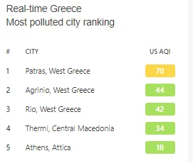 Σύμφωνα με τα ίδια στοιχεία, φέτος τη θεωρητικά πιο μολυσμένη ατμόσφαιρα έχει η Πάτρα, όμως πρέπει να τονιστεί πως με βάση την κλίμακα της IQAir, η ατμόσφαιρα κρίνεται «μέτρια» και όχι κακή. Η πιο καθαρή ατμόσφαιρα μετρήθηκε στα Χανιά για το 2024.