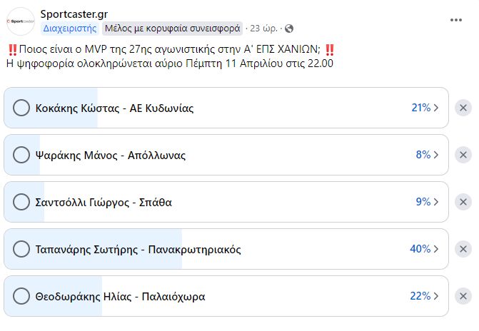 Στη ψηφοφορία του sportcaster.gr, ο Σωτήρης Ταπανάρης συγκέντρωσε το 40% των ψήφων, αφήνοντας στη δεύτερη θέση τον Ηλία Θεοδωράκη της Παλαιόχωρας με 22%.