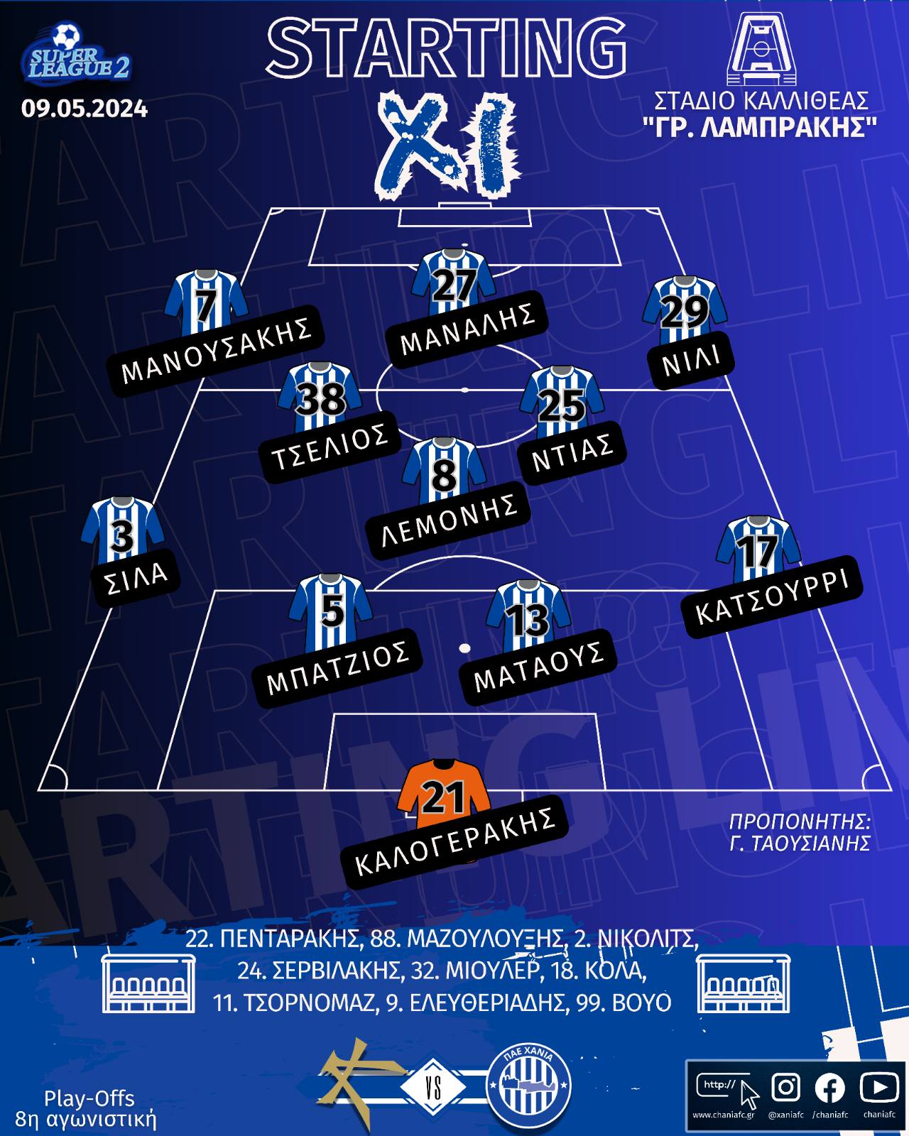 Σε μια ώρα (16:00) ξεκινάει το μεγάλο παιχνίδι των Χανίων απέναντι στην Athens Kallithea στο Ελ Πάσο για την 8η αγωνιστική των play-offs της Super League 2. πριν από λίγο έγιναν γνωστές οι 11άδες των δυο αντιπάλων με τον Γιάννη Ταουσιάνη, αυτή τη φορά να προτιμάει τετράδα στην άμυνα και σύστημα 4-3-3.