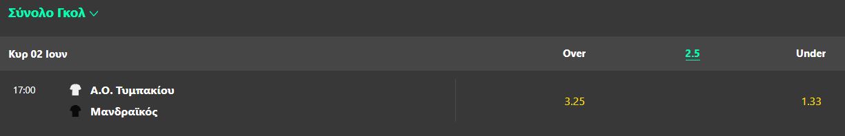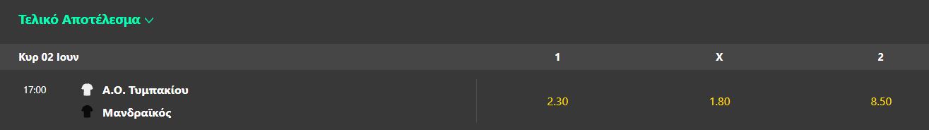 Σήμερα πέφτει η αυλαία των μπαράζ ανόδου με τα βλέμματα όλων να στρέφονται στο Ηράκλειο εκεί που Τυμπάκι και Μανδραϊκός με ισοπαλία ανεβαίνουν “παρέα” στην Γ’ Εθνική κάτι που δεν έχει περάσει απαρατήρητο και από τις στοιχηματικές γεγονός που μαρτυρούν και οι αποδόσεις στο… Χ.