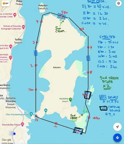 Τον συνόδευσε σκάφος από τη Σχολή Θαλάσσιων Σπορ του Γιάννη Καραγεωργόπουλου. Στο σχετικό χάρτη, που ο Mark σχεδίασε στη διάρκεια της προετοιμασίας του, βλέπουμε τα σημεία στα οποία είχε προγραμματίσει τις ολιγόλεπτες στάσεις του, για τη χρήση αντιηλιακού και την ενυδάτωση.