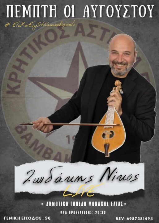Μία πολύ όμορφη κρητική βραδιά διοργανώνει ο Κρητικός Αστέρας στο Δημοτικό γήπεδο Μοναχής Ελιάς την Πέμπτη 1 Αυγούστου. Πιο συγκεκριμένα, με τα τραγούδια του, ο Νίκος Ζωιδάκης υπόσχεται να διασκεδάσει όλους όσους βρεθούν στο γήπεδο. Η εκδήλωση θα ξεκινήσει στις 20:30, με την είσοδο να έχει οριστεί στα 5 ευρώ.
