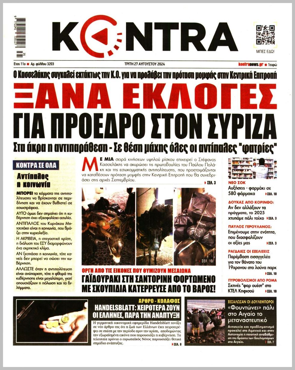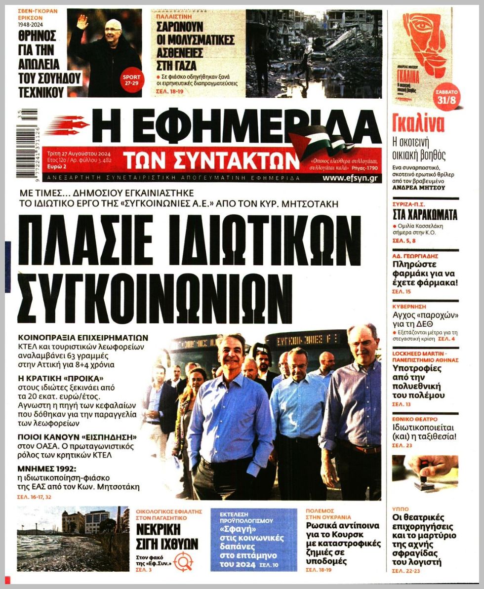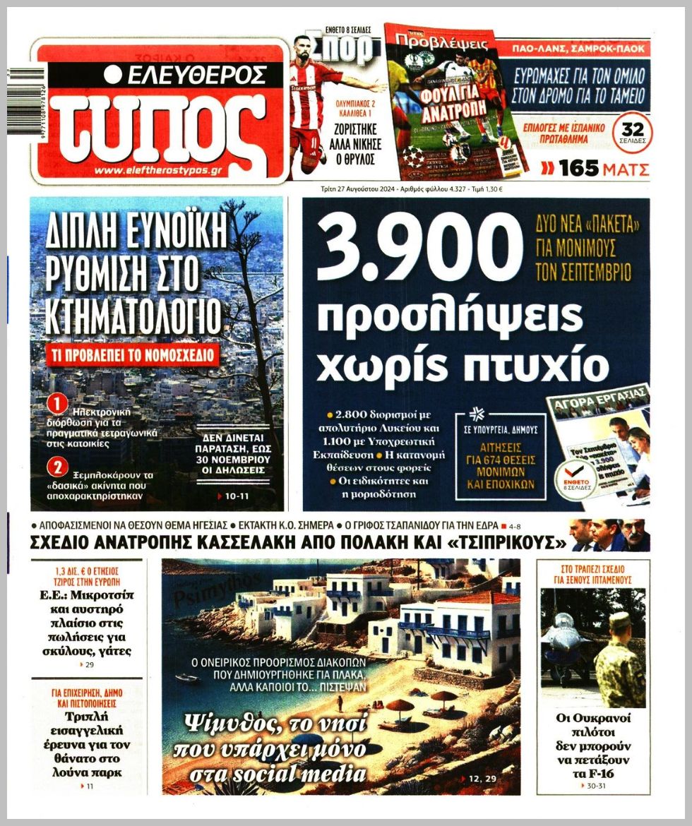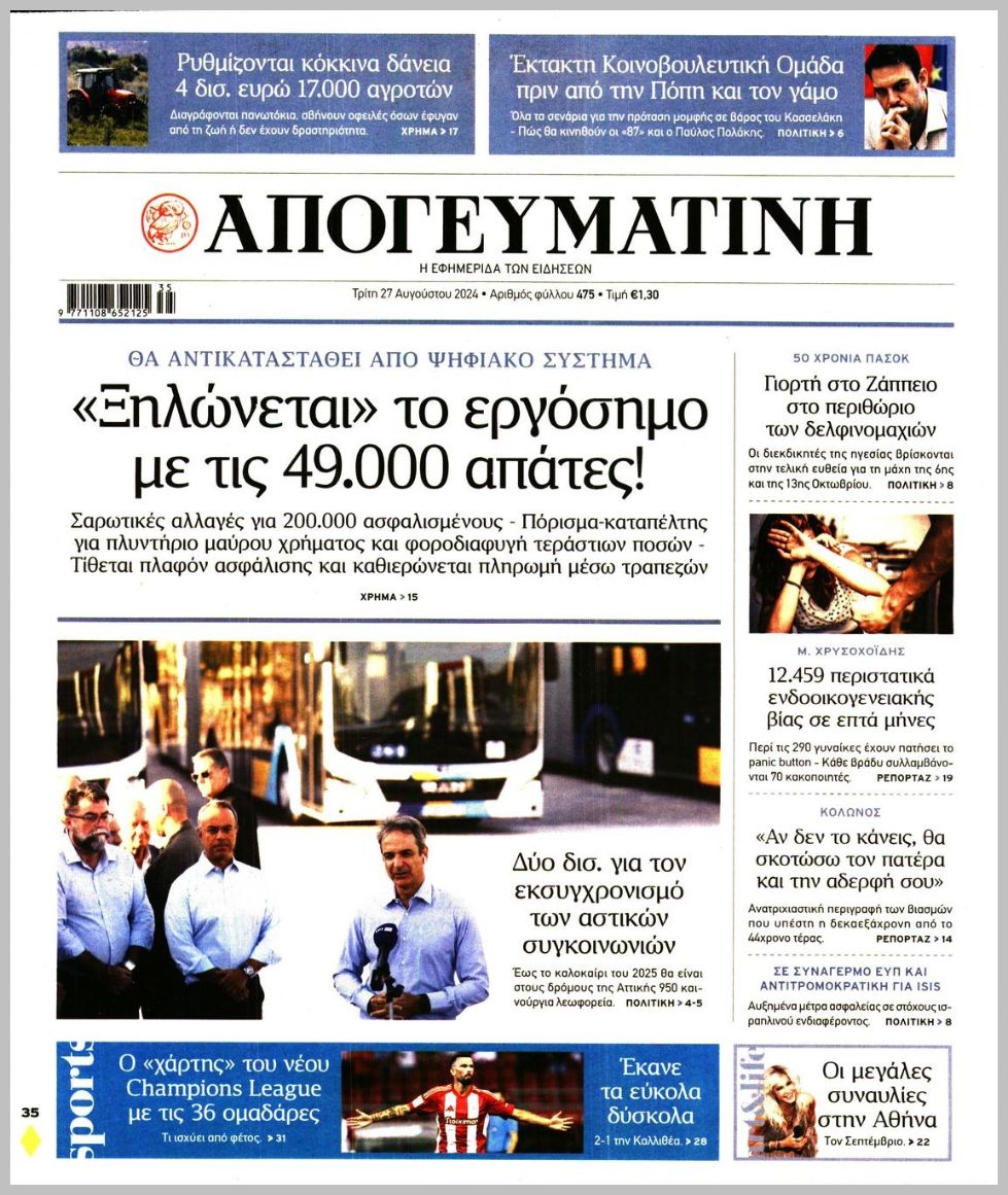 Τα πρωτοσέλιδα της Τρίτης (27/8) σε Κρήτη και Αθήνα