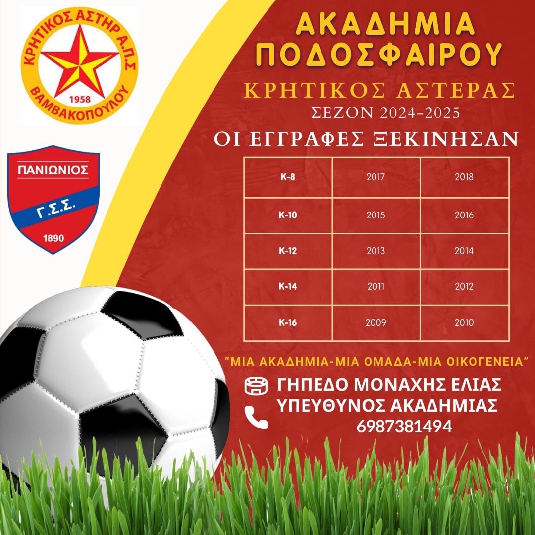 Με σύνθημα “μια ακαδημία, μια ομάδα, μια οικογένεια” ο Κρητικός Αστέρας ετοιμάζεται να ξεκινήσει και εφέτος τη λειτουργία των Ακαδημιών του, αλλά και την συνεργασία του με τον Πανιώνιο. Η ομάδα του Βαμβακόπουλου τον περασμένο Μάιο εντάχθηκε στην γρήγορα αναπτυσσόμενη Panionios Football Academy και έγινε η 7η ομάδα ανά την Ελλάδα που συμπεριλαμβάνεται στο δίκτυο του Ιστορικού ο οποίος από φέτος θα αγωνίζεται στο πρωτάθλημα της Super League 2.