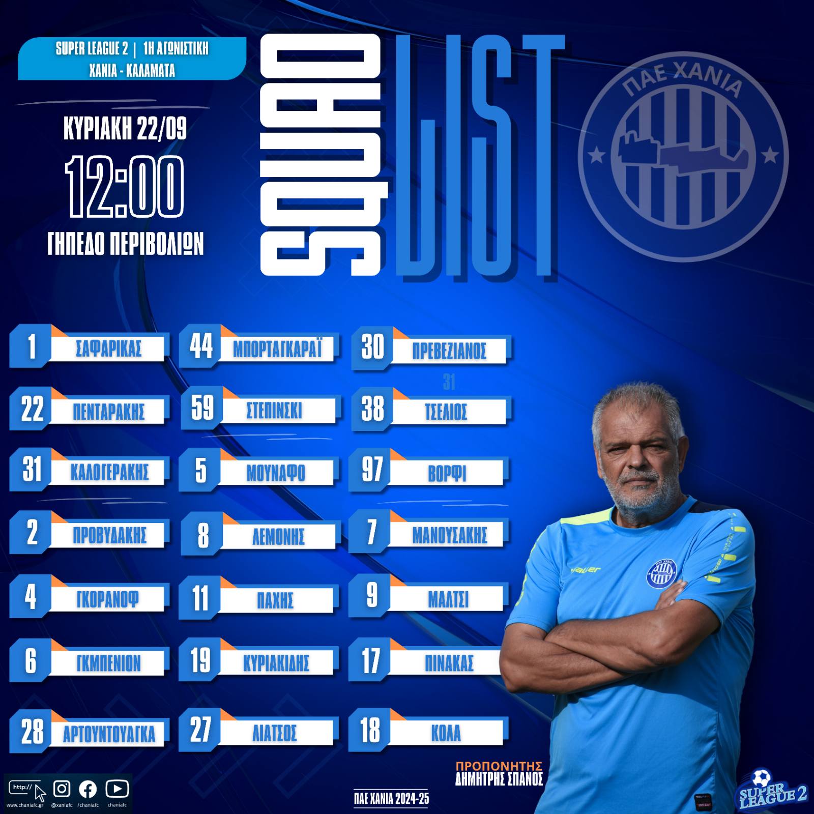 Αμέσως μετά ο προπονητής της ομάδας μας, Δημήτρης Σπανός, ανακοίνωσε την αποστολή στην οποία μετέχουν 21 ποδοσφαιριστές.