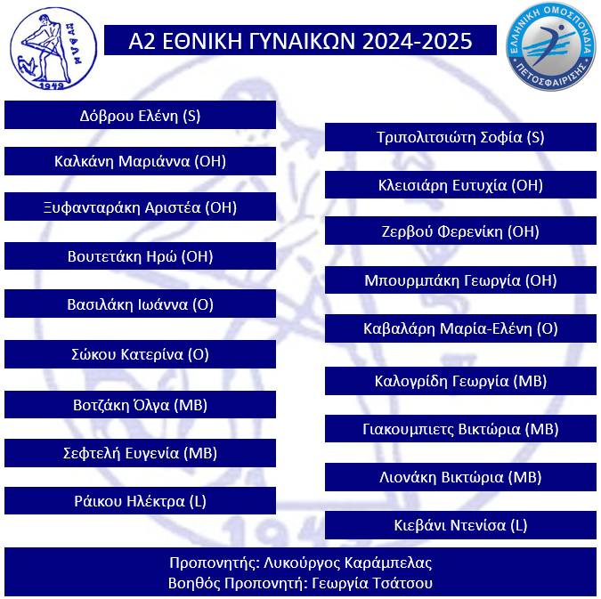 Δόθηκε πριν λίγες ώρες στην Ελληνική Ομοσπονδία Πετοσφαίρισης, το νεανικό (Μ.Ο. 18 έτη) ρόστερ της ομάδας μας που θα συμμετάσχει στον Α’ Όμιλο της Α2 Εθνικής Κατηγορίας Γυναικών.