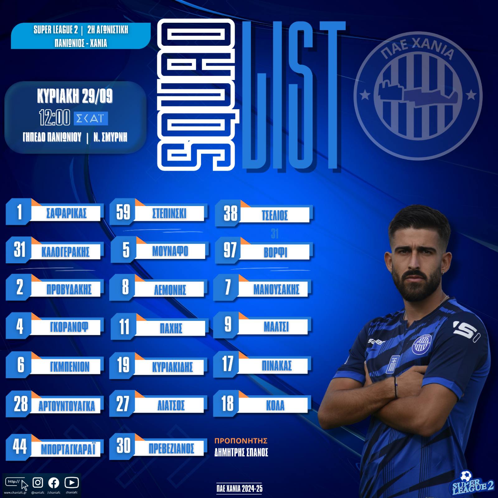 Με είκοσι ποδοσφαιριστές θα αντιμετωπίσουν αύριο (29/9, 12:00) τα Χανιά τον Πανιώνιο για την 2η αγωνιστική του πρωταθλήματος της Super League 2.