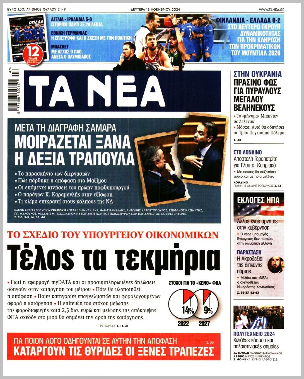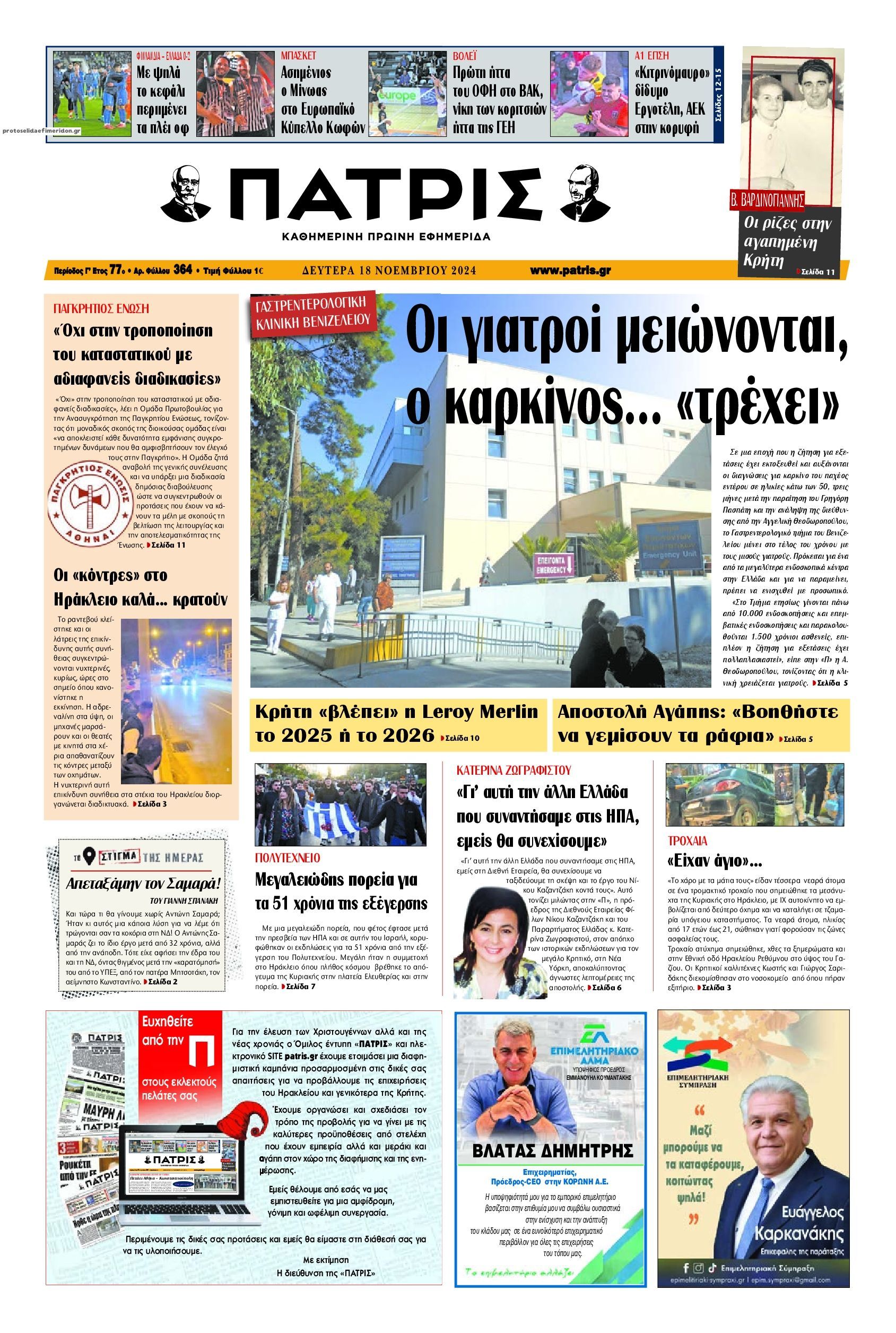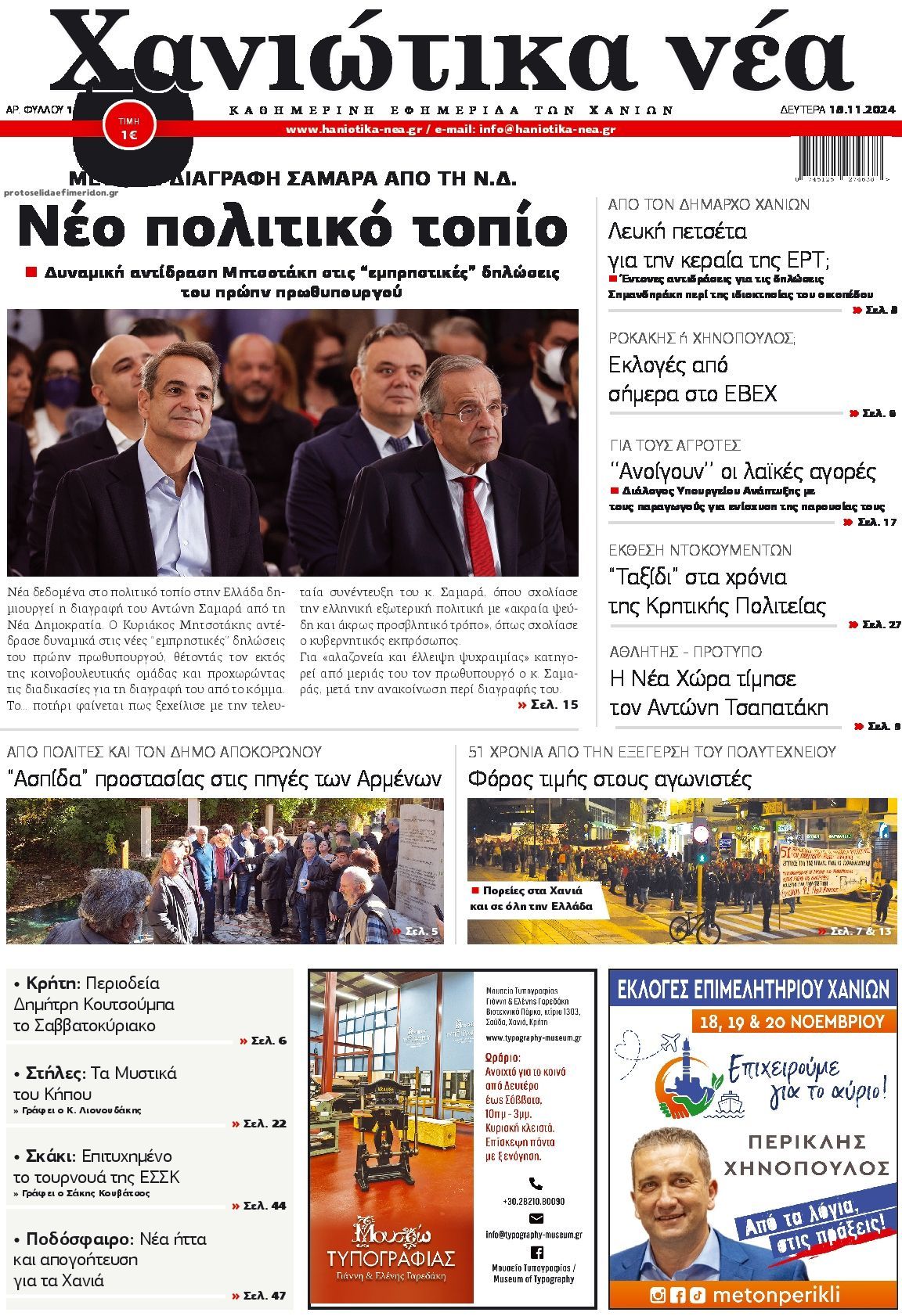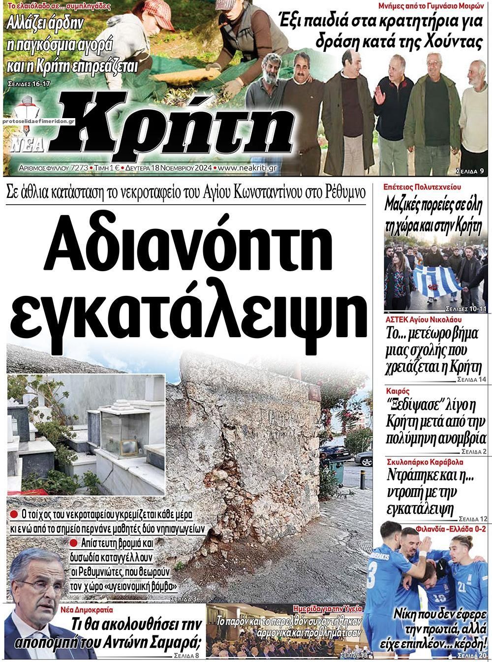 Τα πρωτοσέλιδα της Δευτέρας (18/11) σε Κρήτη και Αθήνα