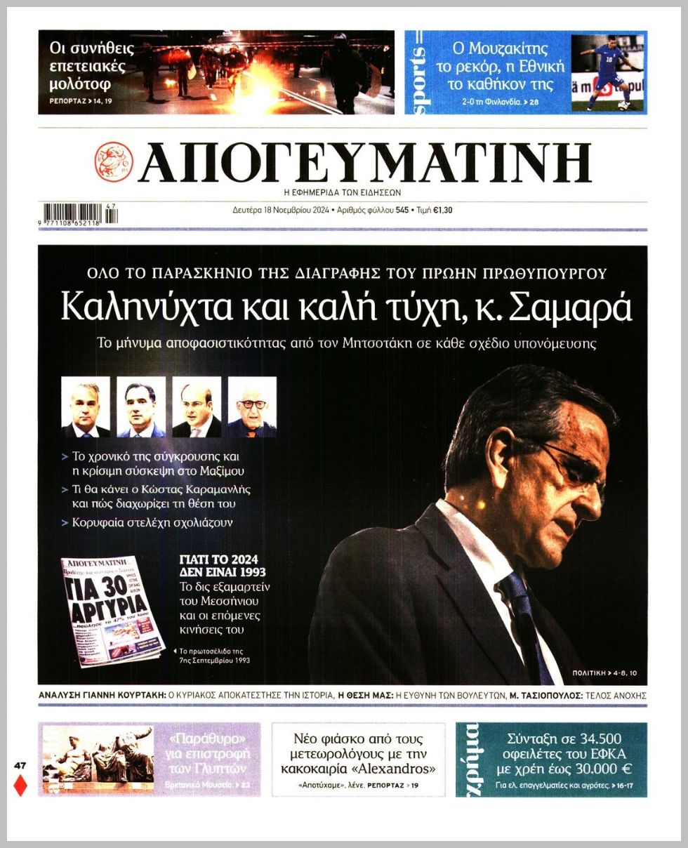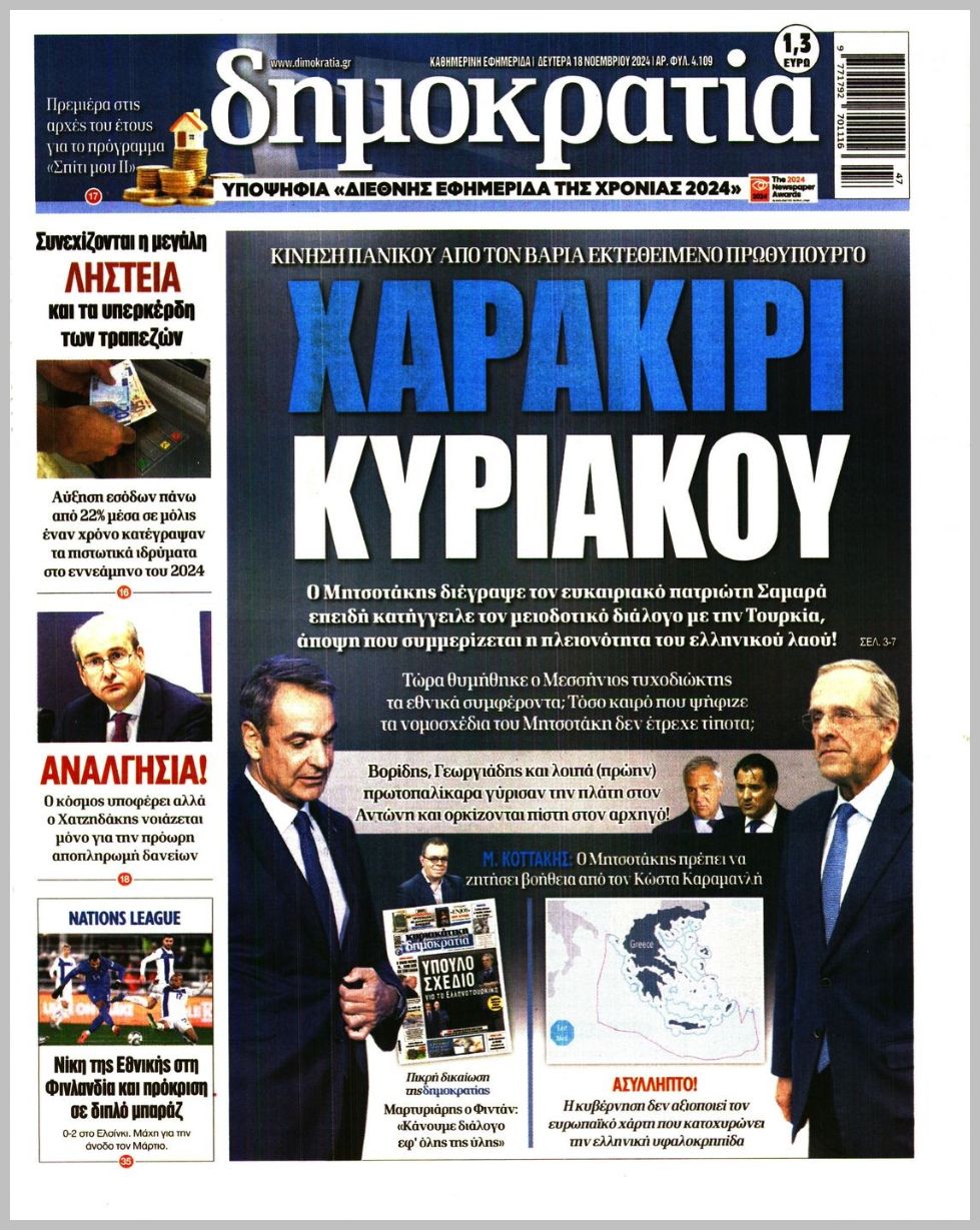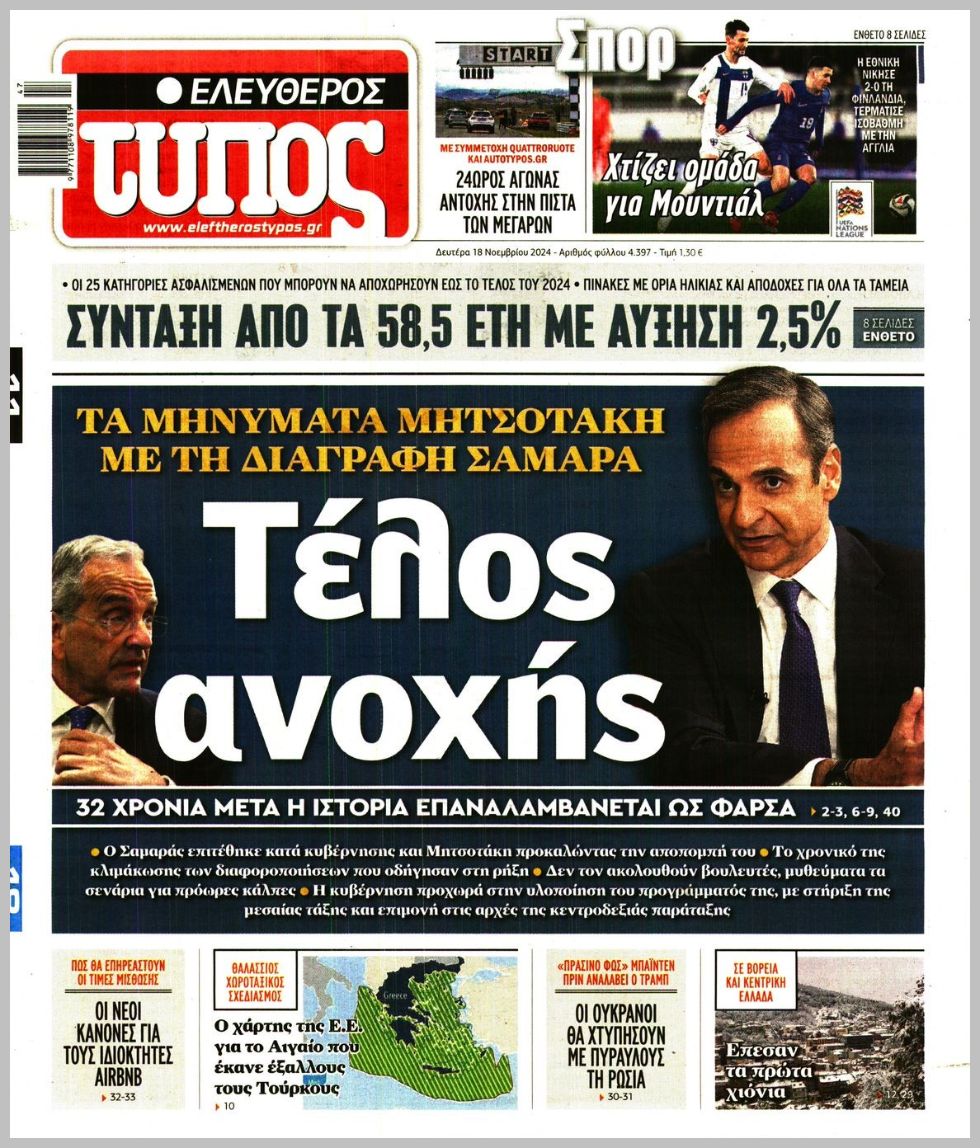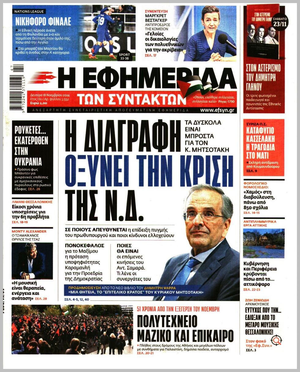 Τα πρωτοσέλιδα της Δευτέρας (18/11) σε Κρήτη και Αθήνα