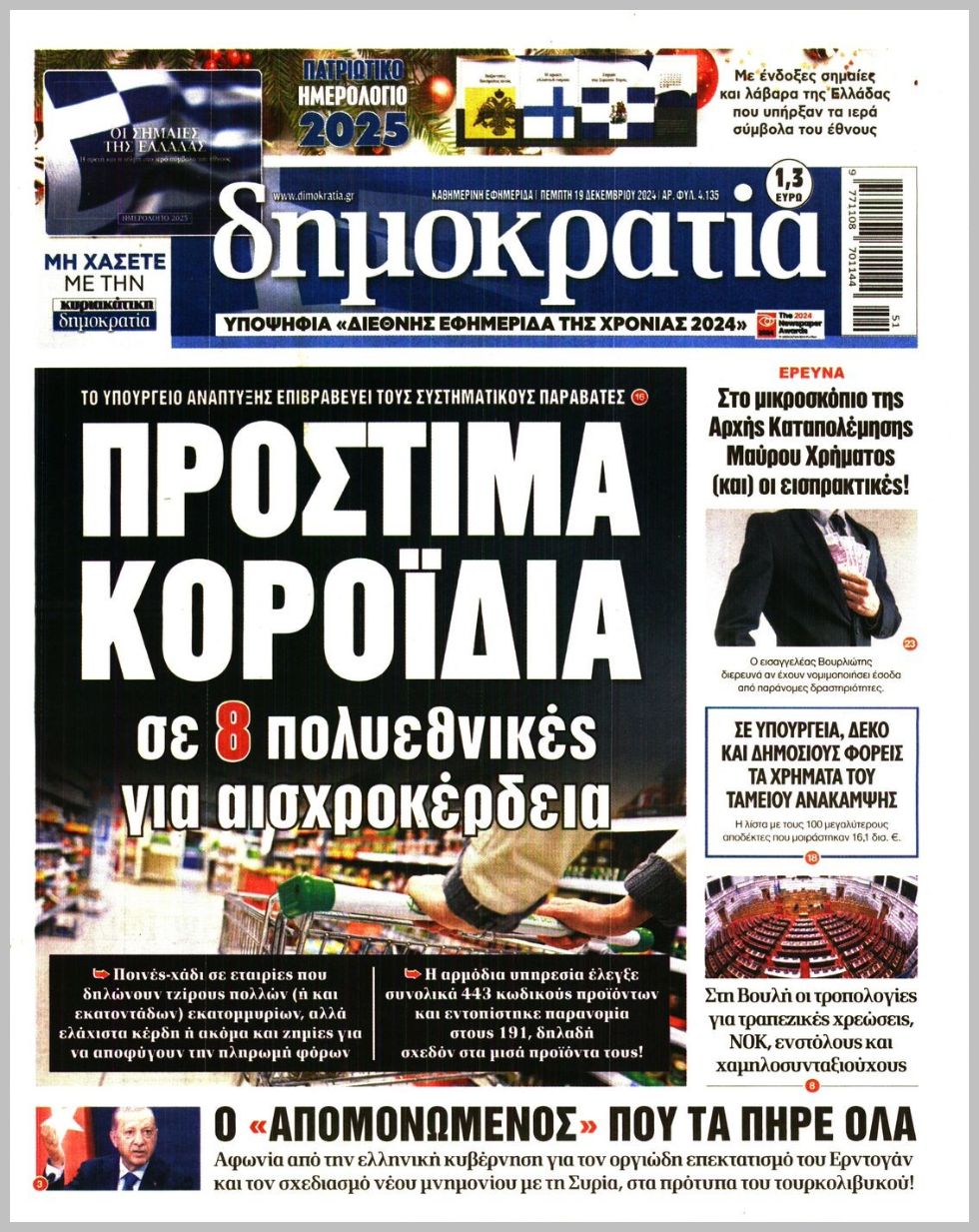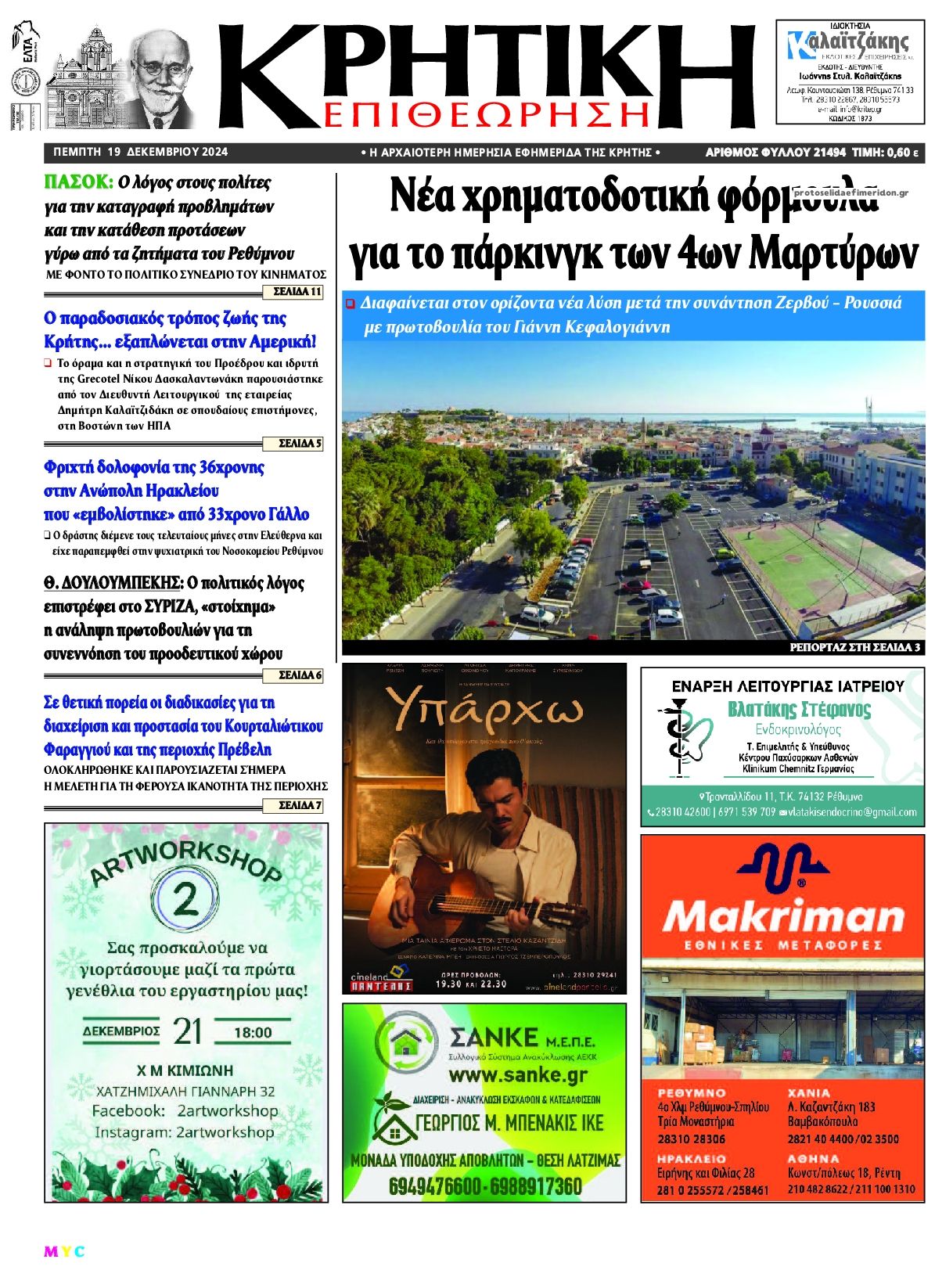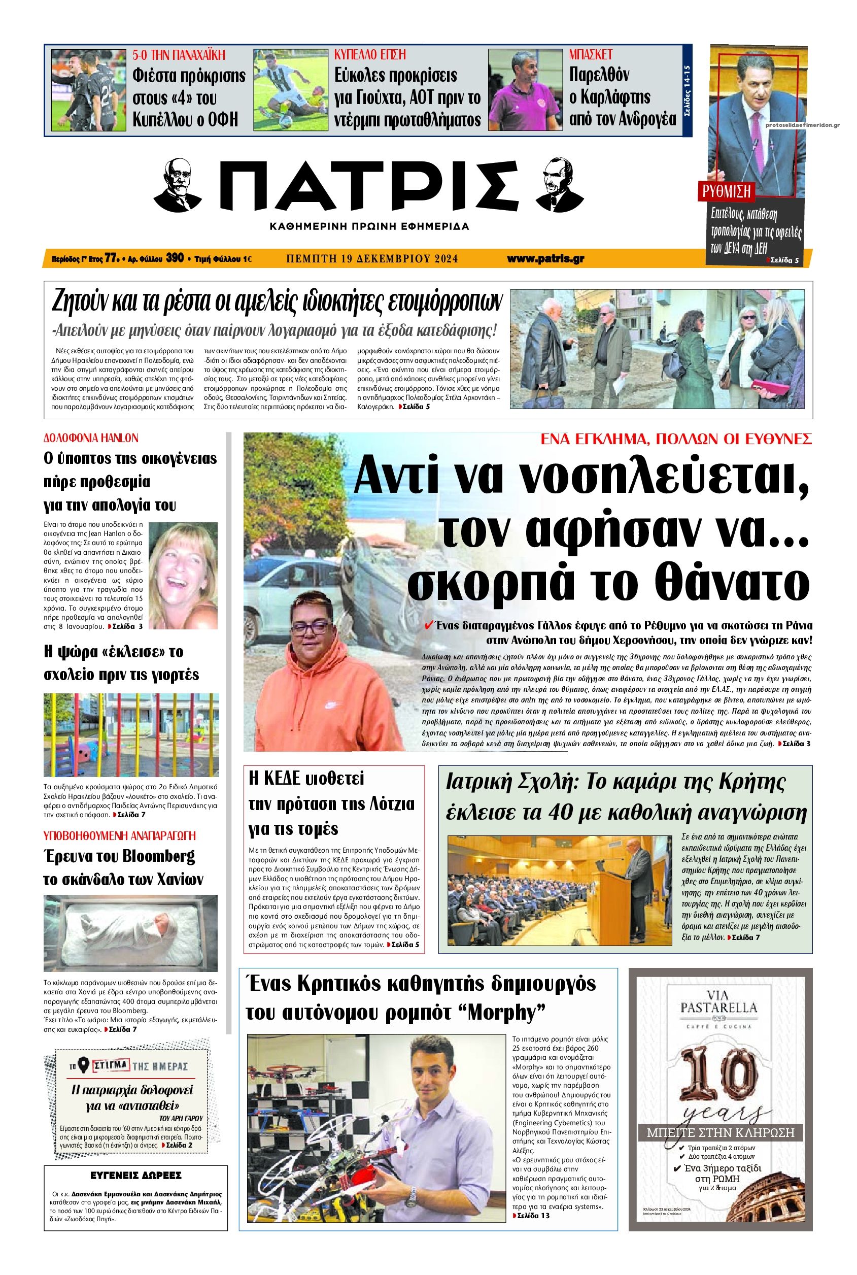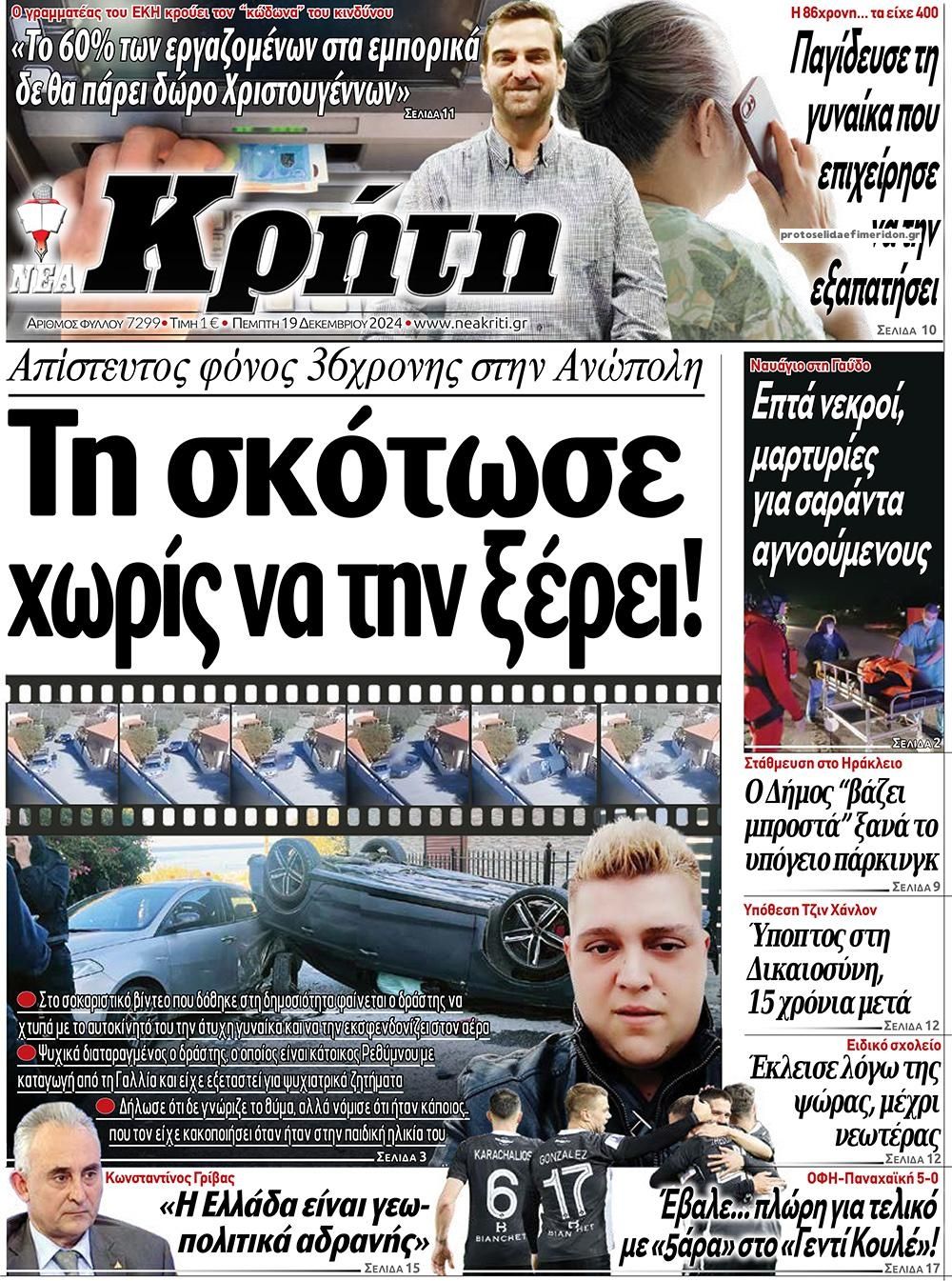 Τα πρωτοσέλιδα της Πέμπτης (19/12) σε Κρήτη και Αθήνα