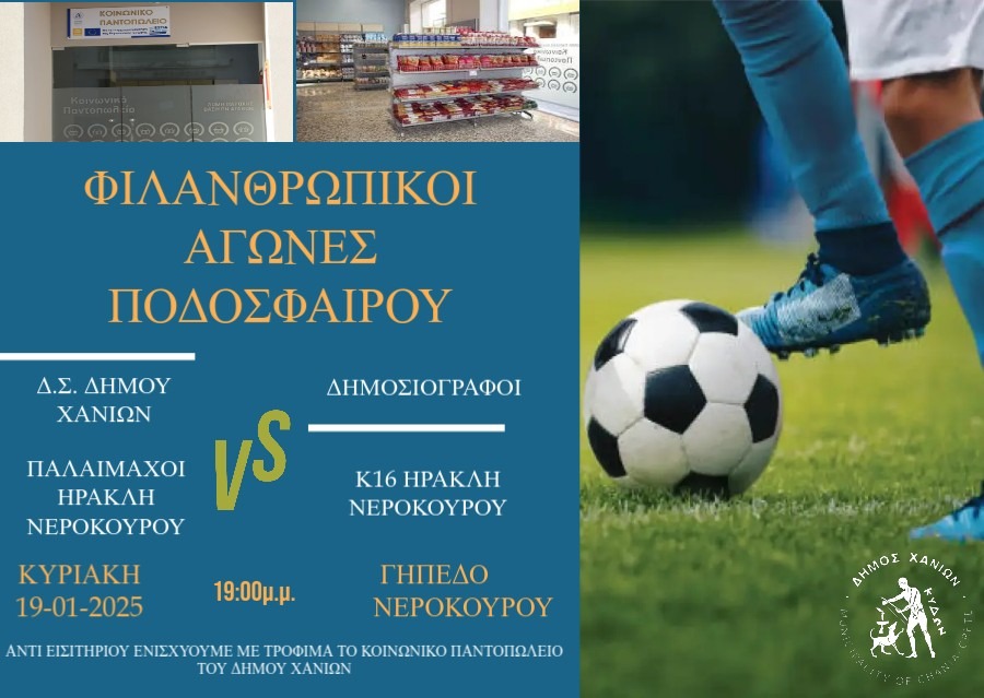 Πρόκειται για φιλανθρωπικό τουρνουά ποδοσφαίρου που έχει σκοπό την ενίσχυση του Κοινωνικού Παντοπωλείου του Δήμου Χανίων. Στο τουρνουά, που συνδιοργανώνουν το Τμήμα Αθλητισμού και το Τμήμα Κοινωνικής Πολιτικής της Διεύθυνσης Κοινωνικής Προστασίας του Δήμου Χανίων, θα αναμετρηθούν μέλη του Δημοτικού Συμβουλίου του Δήμου Χανίων, δημοσιογράφοι, παλαίμαχοι του Ηρακλή Νεροκούρου και ποδοσφαιριστές της Κ16 του Ηρακλή Νεροκούρου.