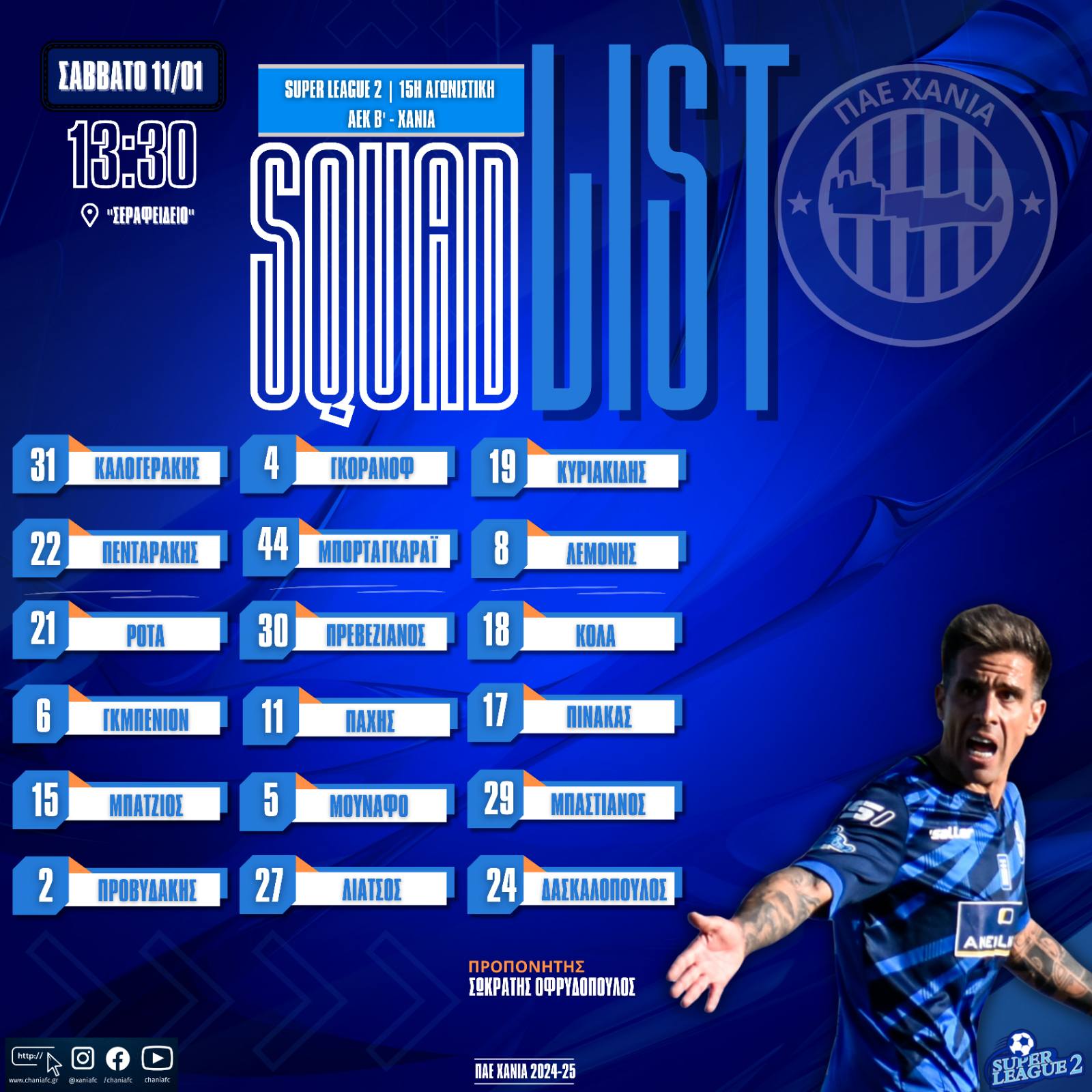 Με αρκετές απουσίες θα παραταχθούν τα Χανιά στο Σεραφείδειο γήπεδο όπου αύριο θα αντιμετωπίσουν την ΑΕΚ Β στο πλαίσιο της 15ης αγωνιστικής του πρωταθλήματος της Super League 2. Ο Σωκράτης Οφρυδόπουλος αντιμετωπίζει αρκετά προβλήματα καθώς εκτός αποστολής έμειναν οι τιμωρημένοι Τσέλιος και Μανουσάκης, όπως και ο τραυματίας Κωστανάσιος.